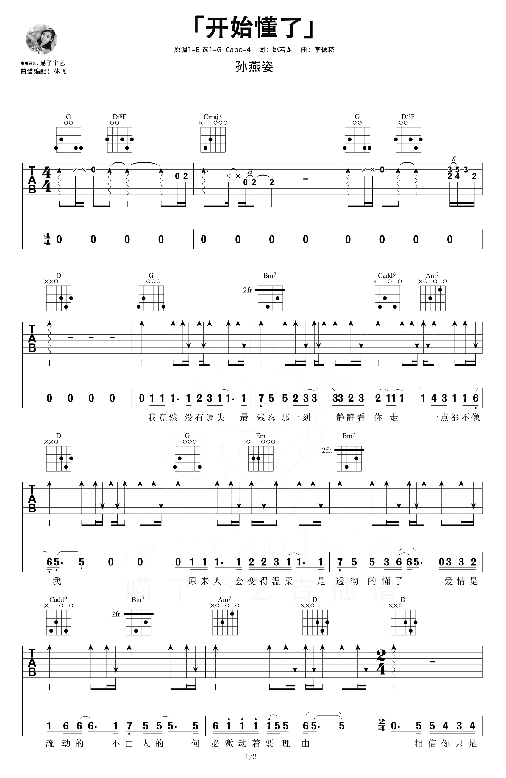 开始懂了吉他谱_G调_孙燕姿曲谱原调B选调G,两张图片六线谱。...