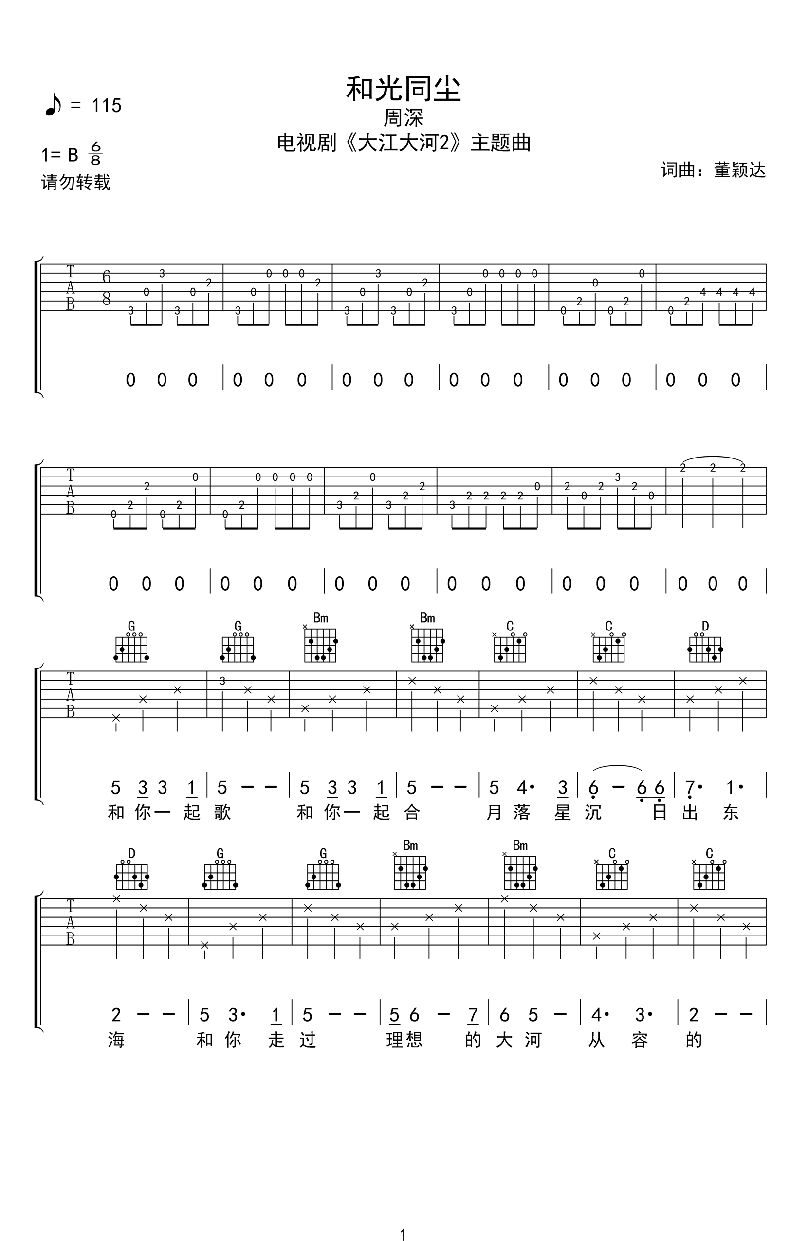 和光同尘吉他谱_周深《大江大河》弹唱谱_完整版六线谱原调B,6/8拍,速度每分钟115拍,六线谱完整版编配,共四张高清图片谱。...