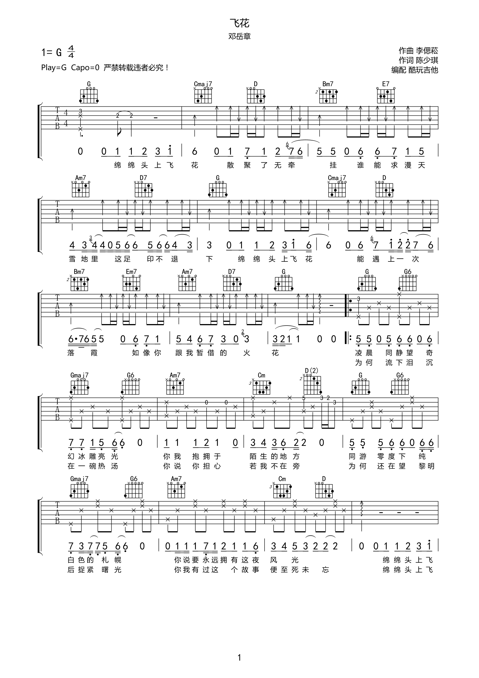 邓岳章《飞花》吉他谱-G调弹唱谱高清原版谱如像你跟我暂借的火花绵绵头上飞花散聚了无牵挂谁能求漫天雪地里这足印不退下绵绵头上飞花能遇上一次落霞如像你跟我暂借的火花怀念那一刹耀眼的火花...