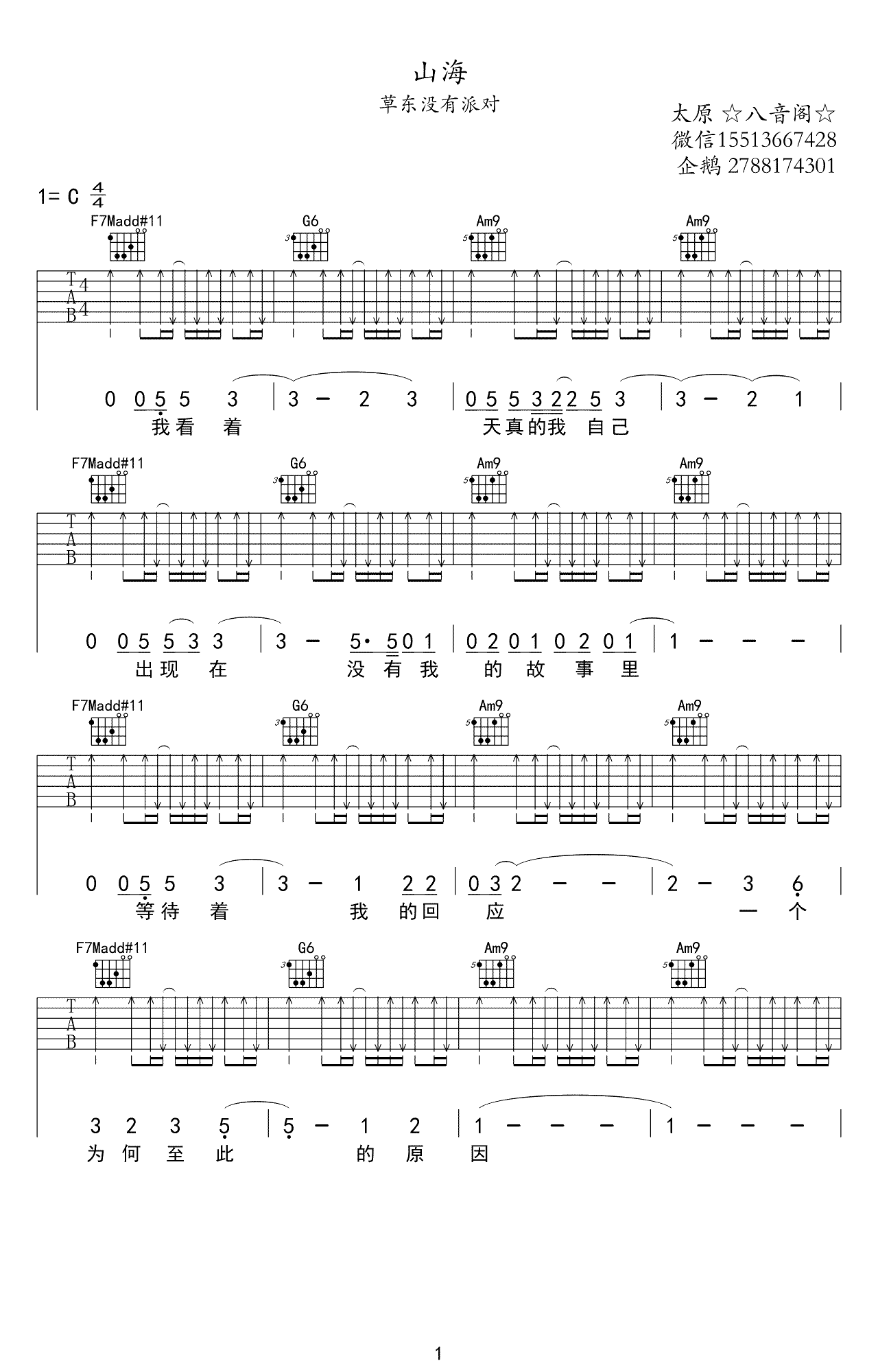 山海吉他谱_C调扫弦版_草东没有派对_原版弹唱六线谱选用C调和弦指法,扫弦版编配,三张高清图片六线谱。...