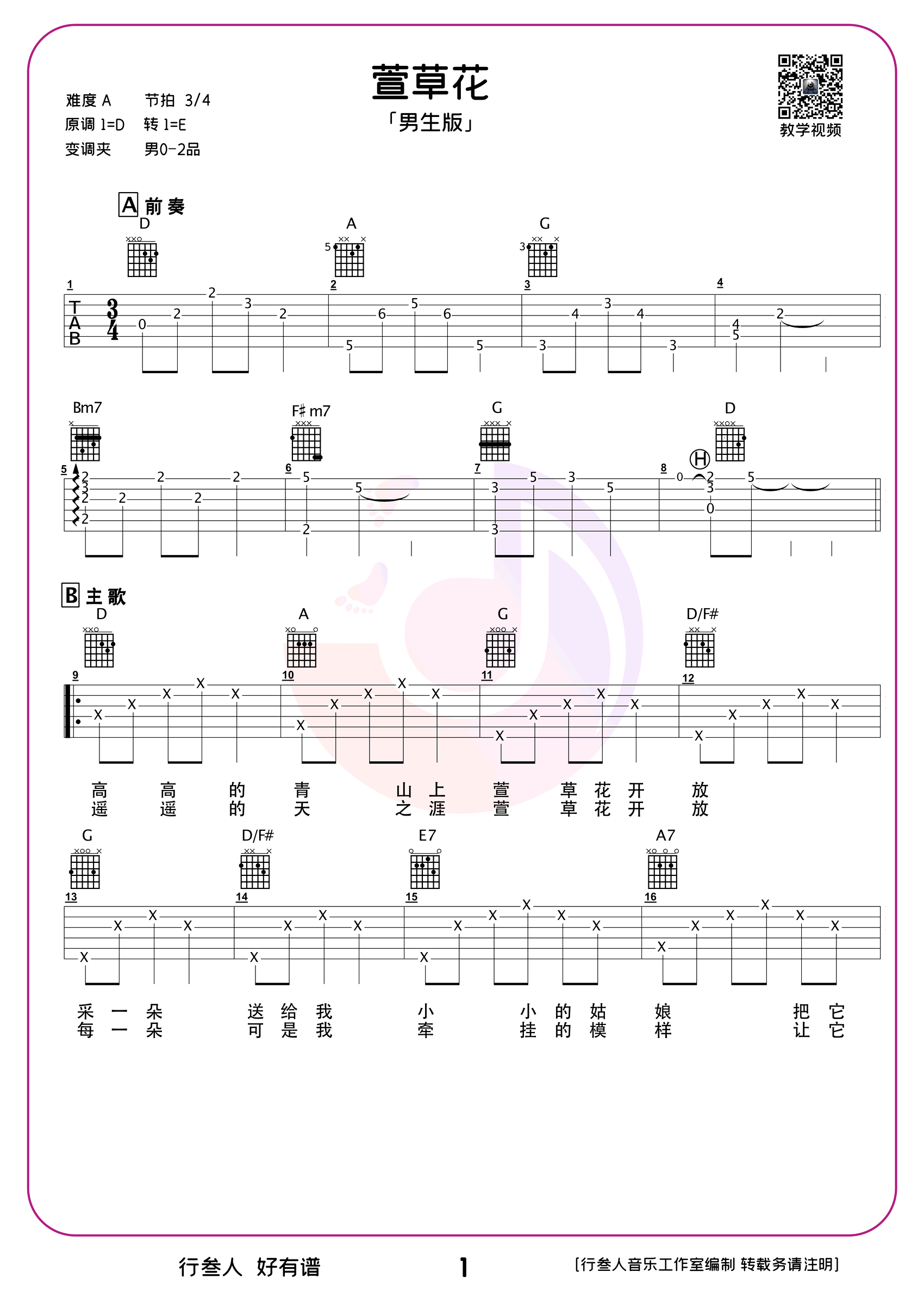 吉他萱草花吉他谱_男生版_弹唱_高清六线谱