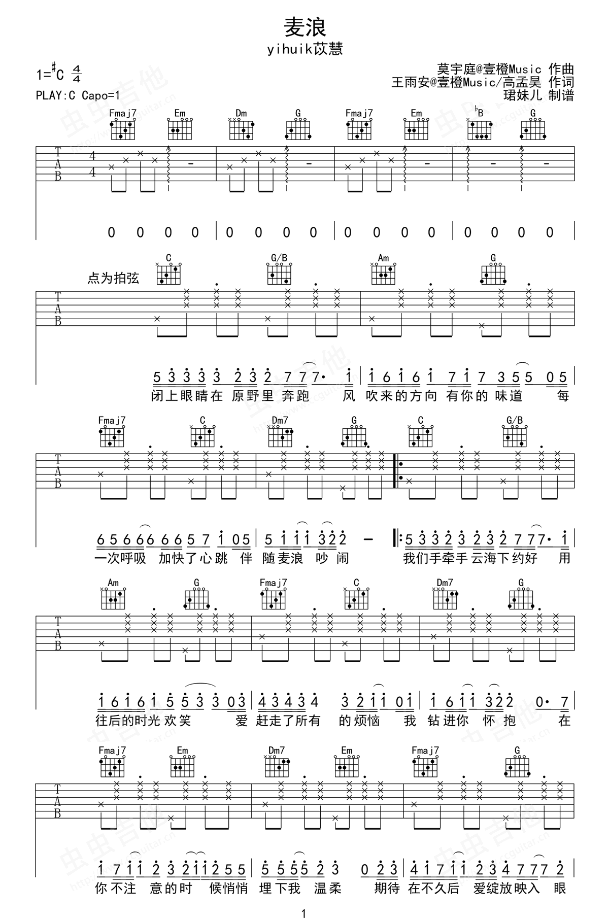 麦浪吉他谱_C调简单版_yihuik苡慧《麦浪》吉他弹唱谱原调升C,选用C调指法,Capo夹一品,初级易弹,共三张图片六线谱。...