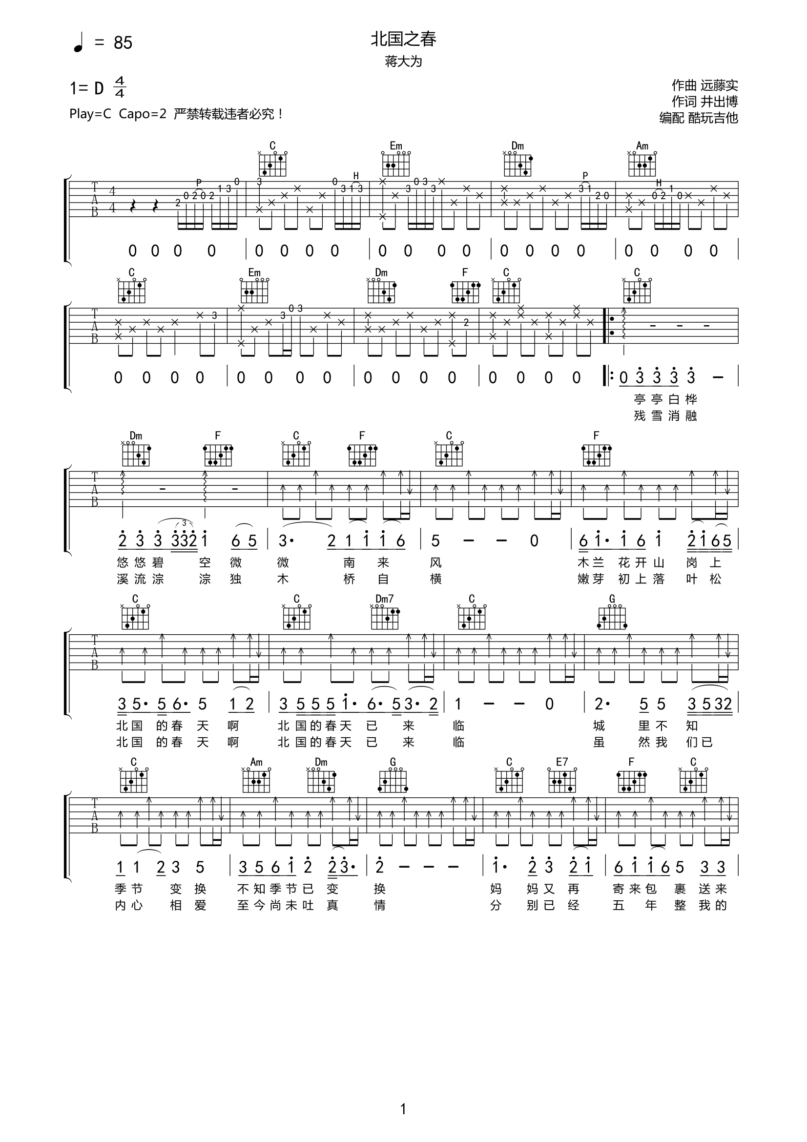 吉他蒋大为《北国之春》吉他谱-C调弹唱谱高清原版谱