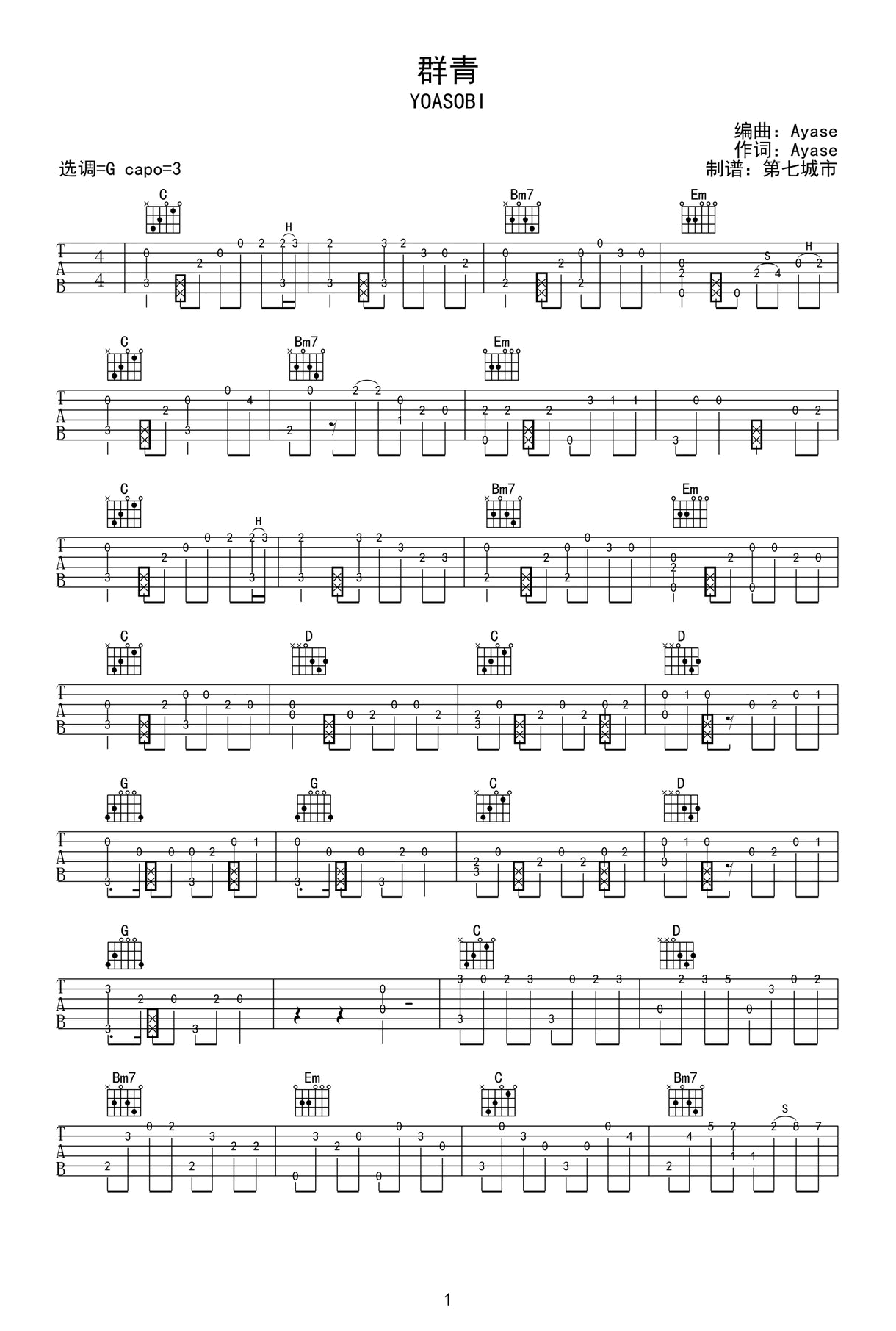 群青吉他指弹谱_YOASOBI_G调_吉他独奏六线谱选调G,变调夹夹三品,完整版共五张图片谱。...