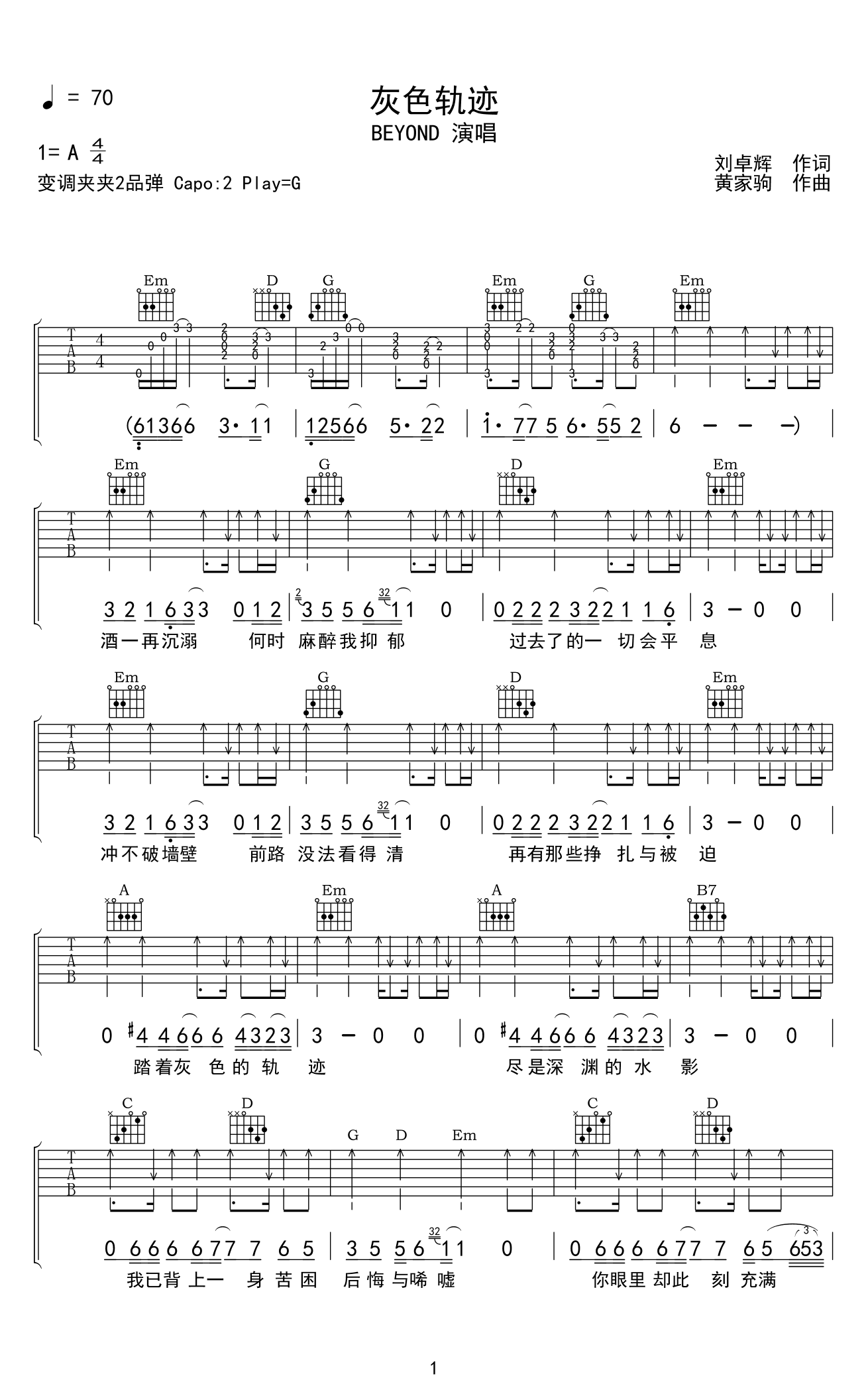灰色轨迹吉他谱_G调指法_Beyond_弹唱六线谱原调A选调G,变调夹夹第二品,完整版共四张图片六线谱。...
