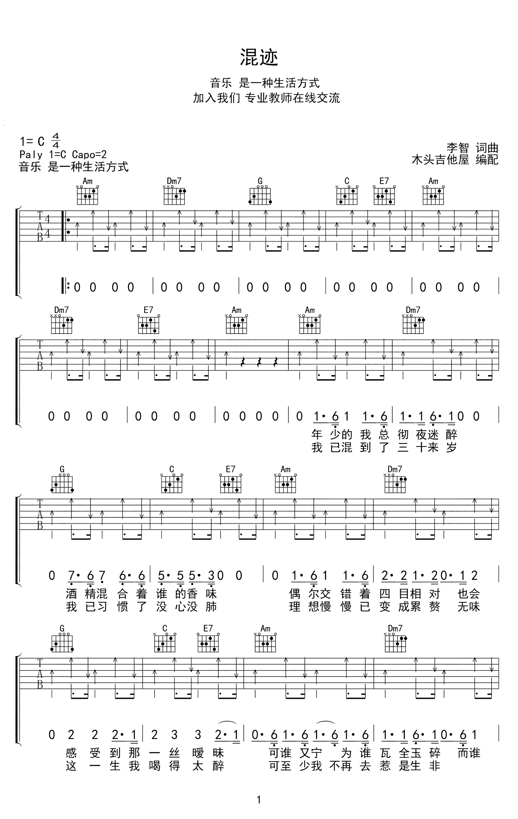吉他混迹吉他谱_李智_C调弹唱谱_高清六线谱
