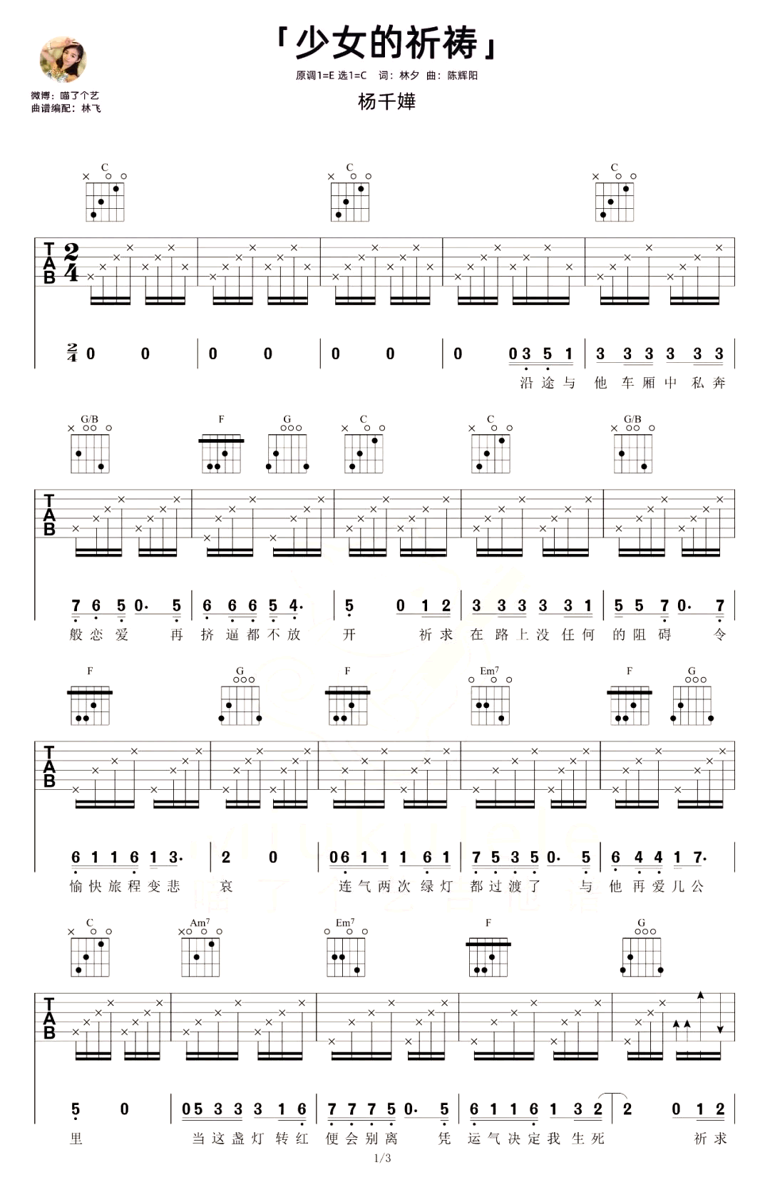 少女的祈祷吉他谱_杨千嬅_C调_弹唱C调弹唱谱共三张图片六线谱。...