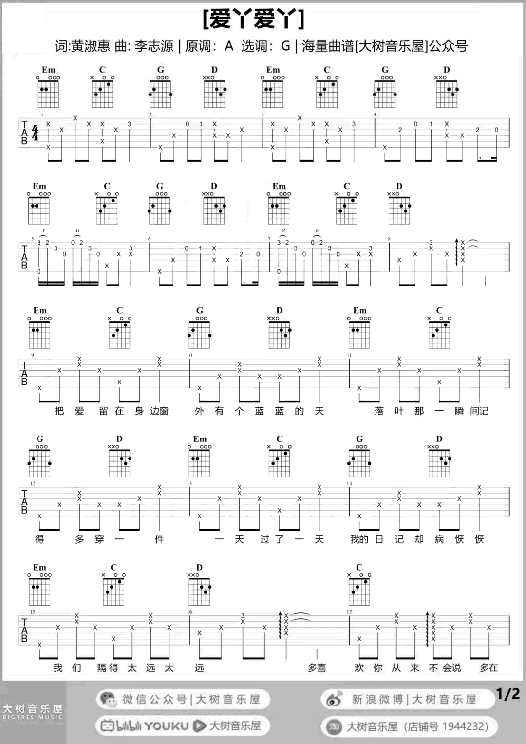 爱丫爱丫吉他谱_BY2_G调_弹唱原调A选调G,变调夹夹二品。男生可以根据自己音域夹3-4品,三张图片谱例。...