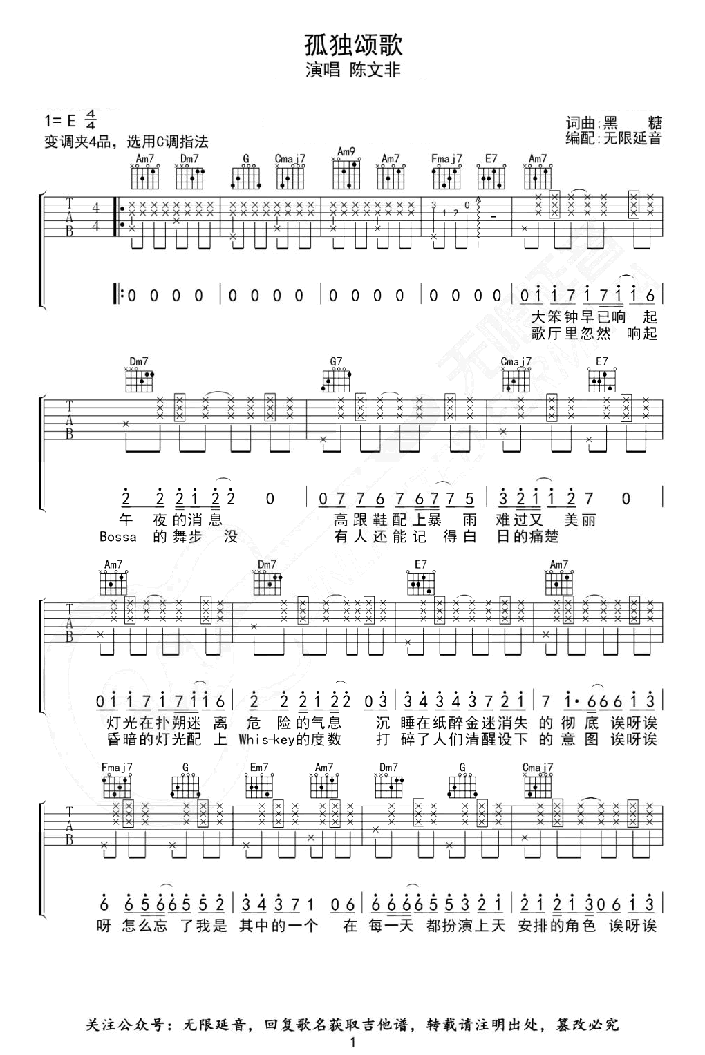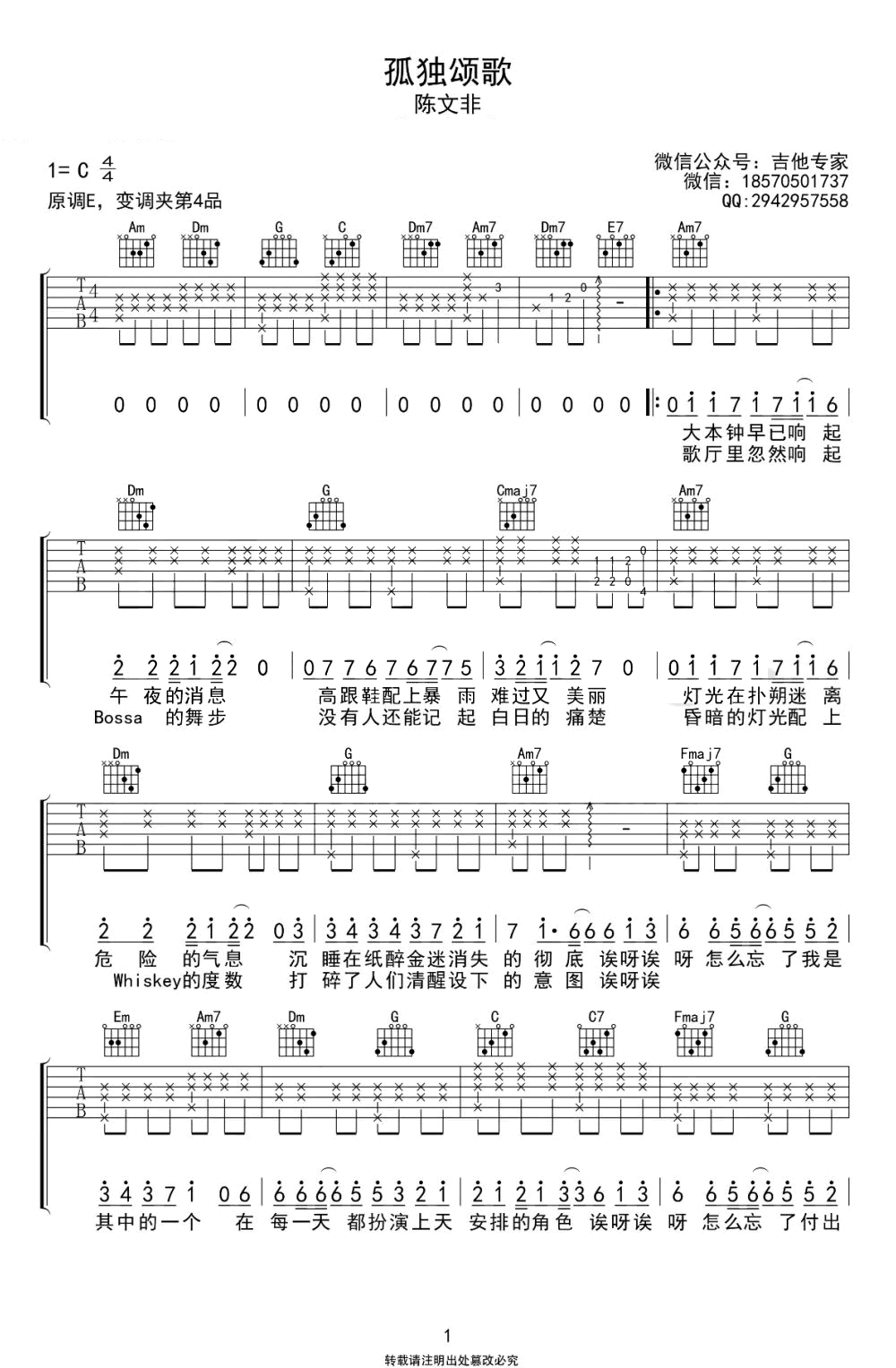 孤独颂歌吉他谱_C调_陈文非_吉他弹唱谱_图片谱原调E,变调夹夹第四品,选用C调指法,两张图片六线谱。...