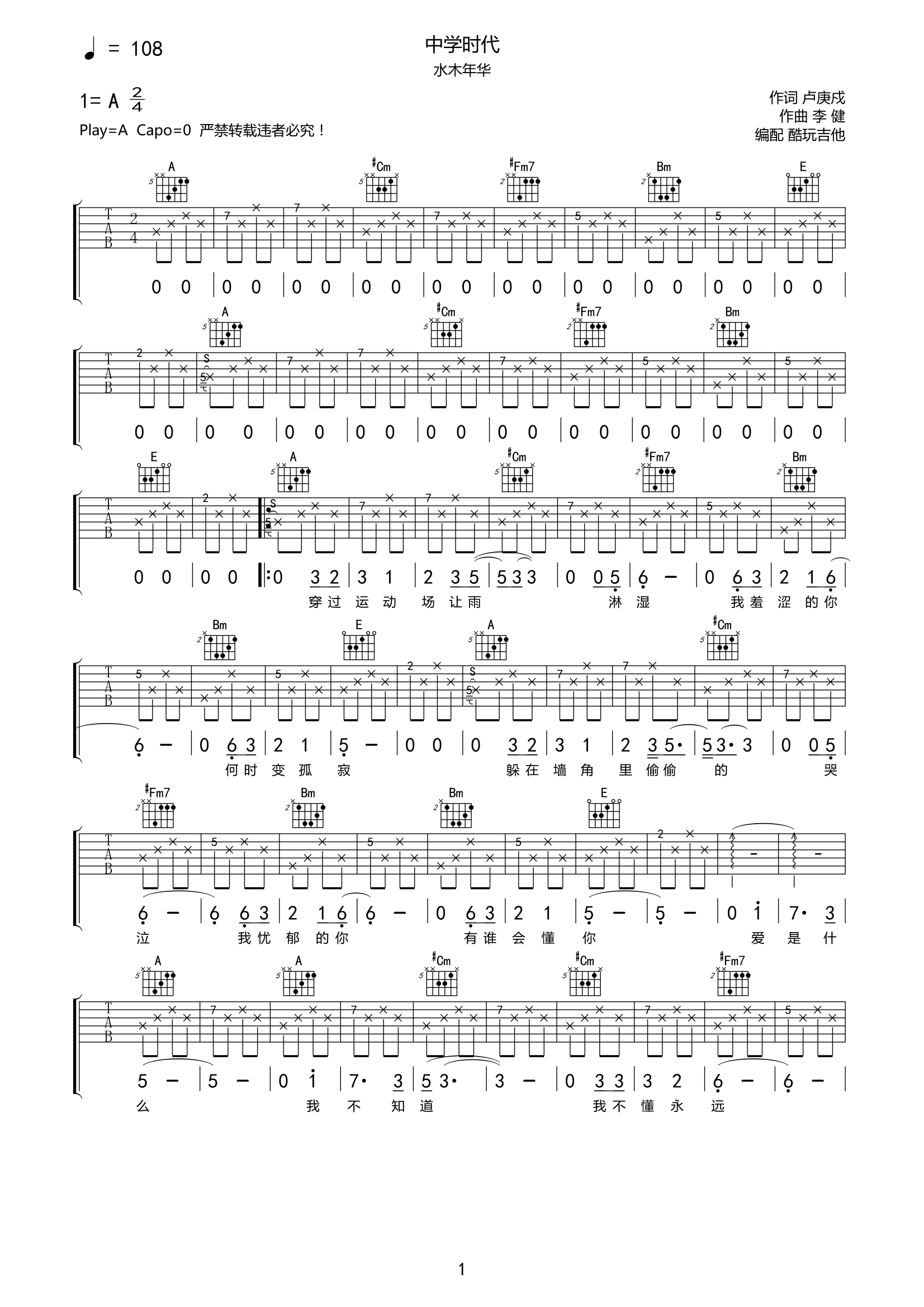 李健《中学时代》吉他谱-A调弹唱谱高清原版谱《中学时代》是李健(作曲)在水木年华组合时与卢庚戌(作词)合作创作的一首歌曲,收录在专辑《一生有你》中。...