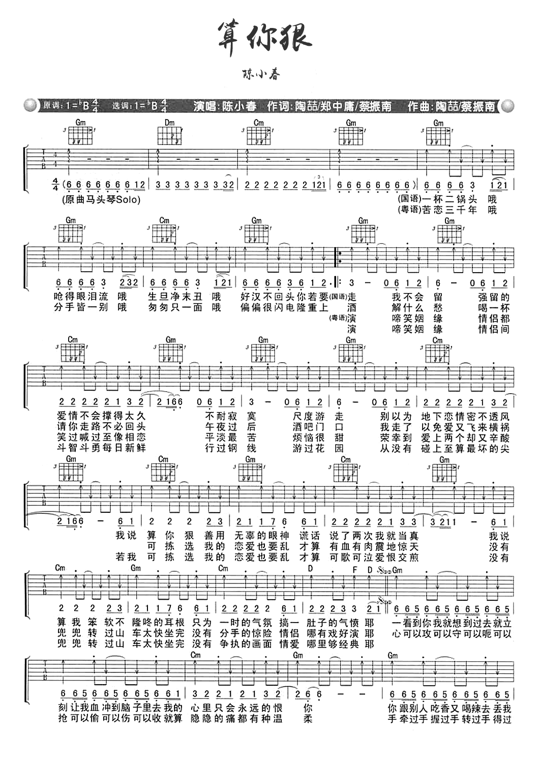 算你狠吉他谱_陈小春_弹唱谱_《算你狠》六线谱他弹唱谱,原调降B指法,两张图片六线谱...