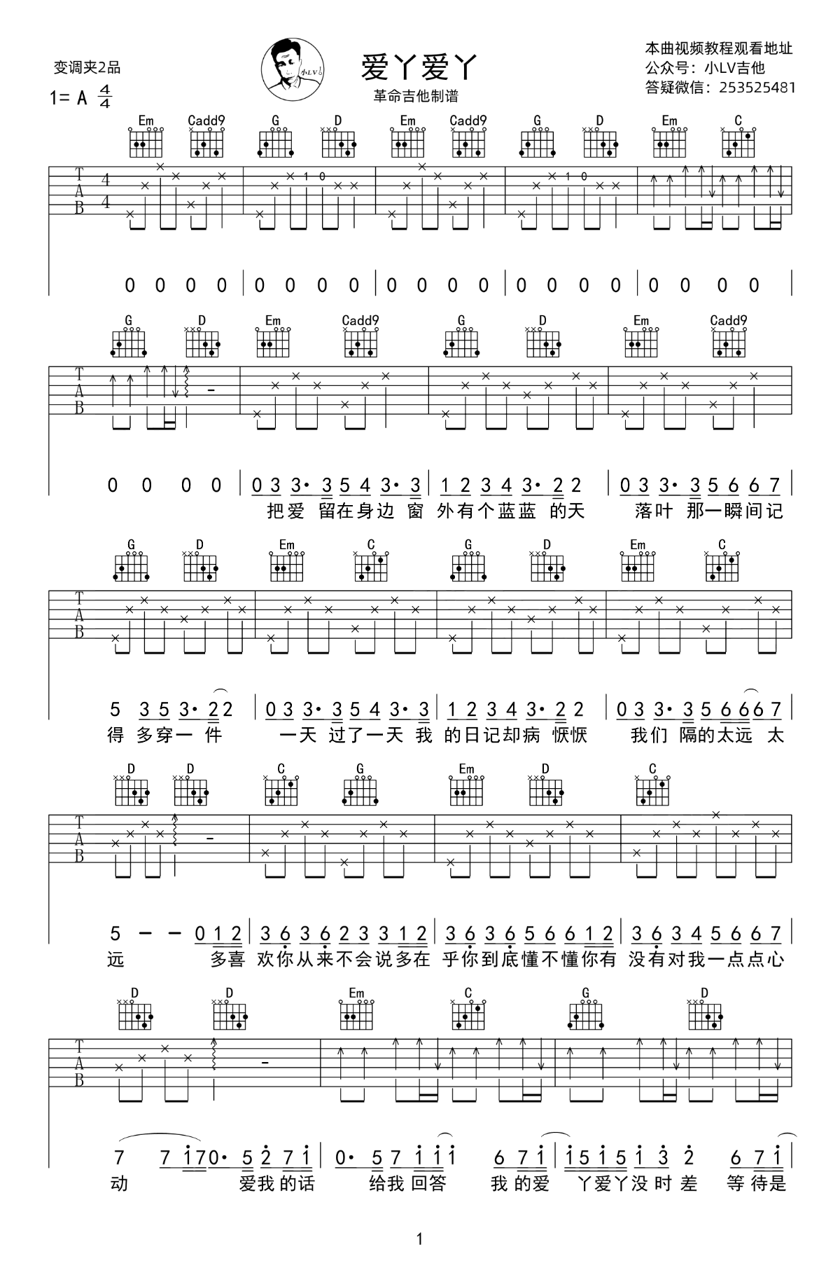 爱丫爱丫吉他谱_BY2__G调弹唱谱歌曲原调A,变调夹夹二品,选用G调指法编配,两张图片六线谱。...