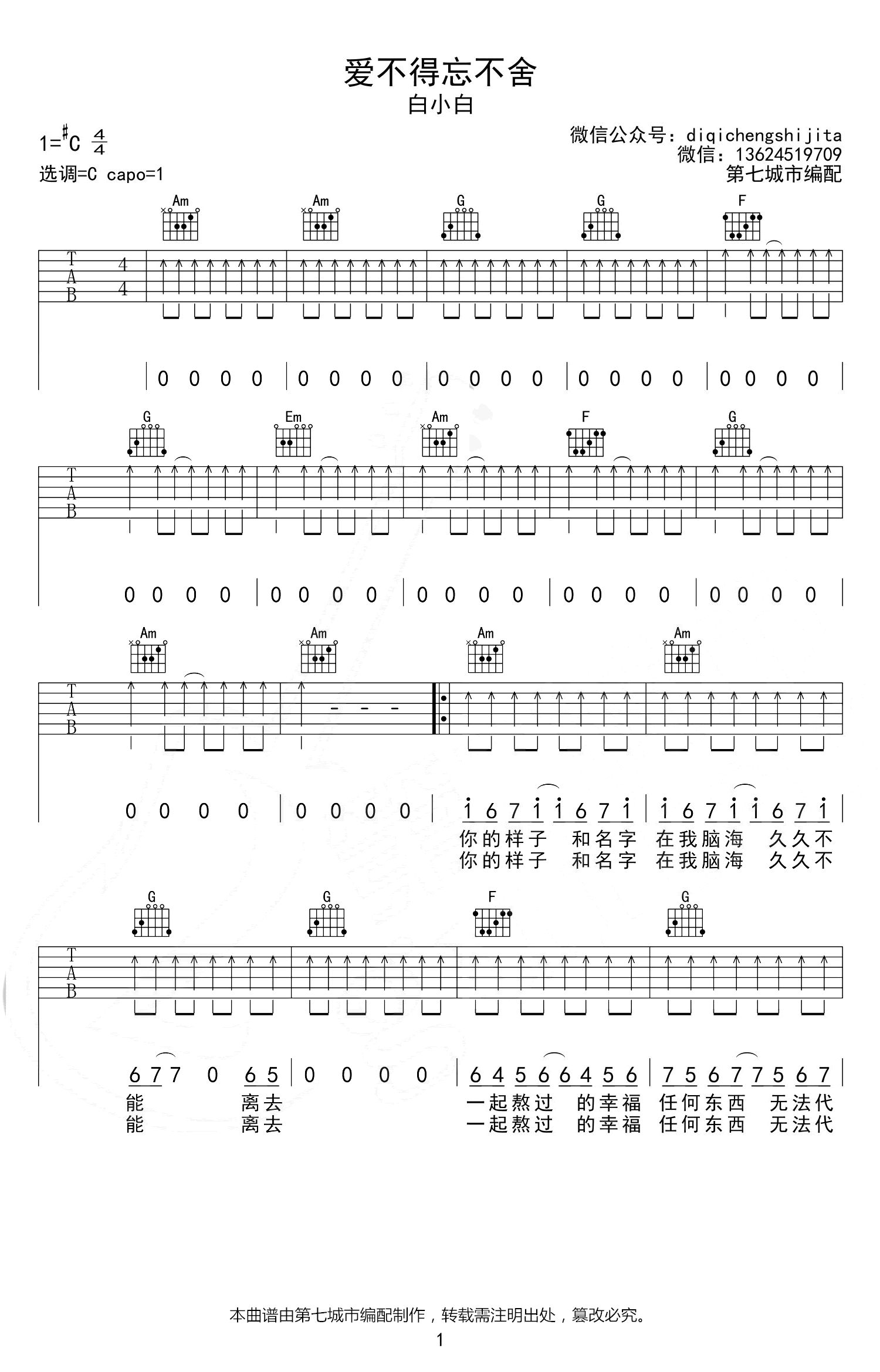 爱不得忘不舍吉他谱_C调_白小白_弹唱六线谱原调升C选调C,CAPO夹一品,三张高清图片六线谱。...