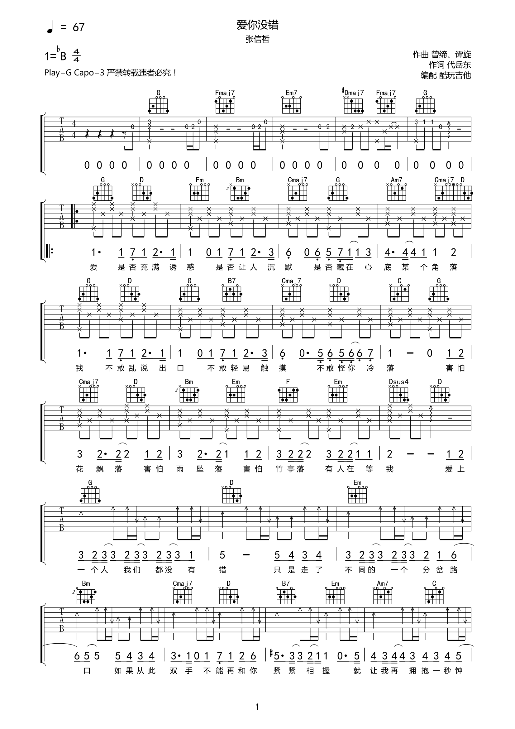 吉他张信哲《爱你没错》吉他谱-G调弹唱谱高清原版谱