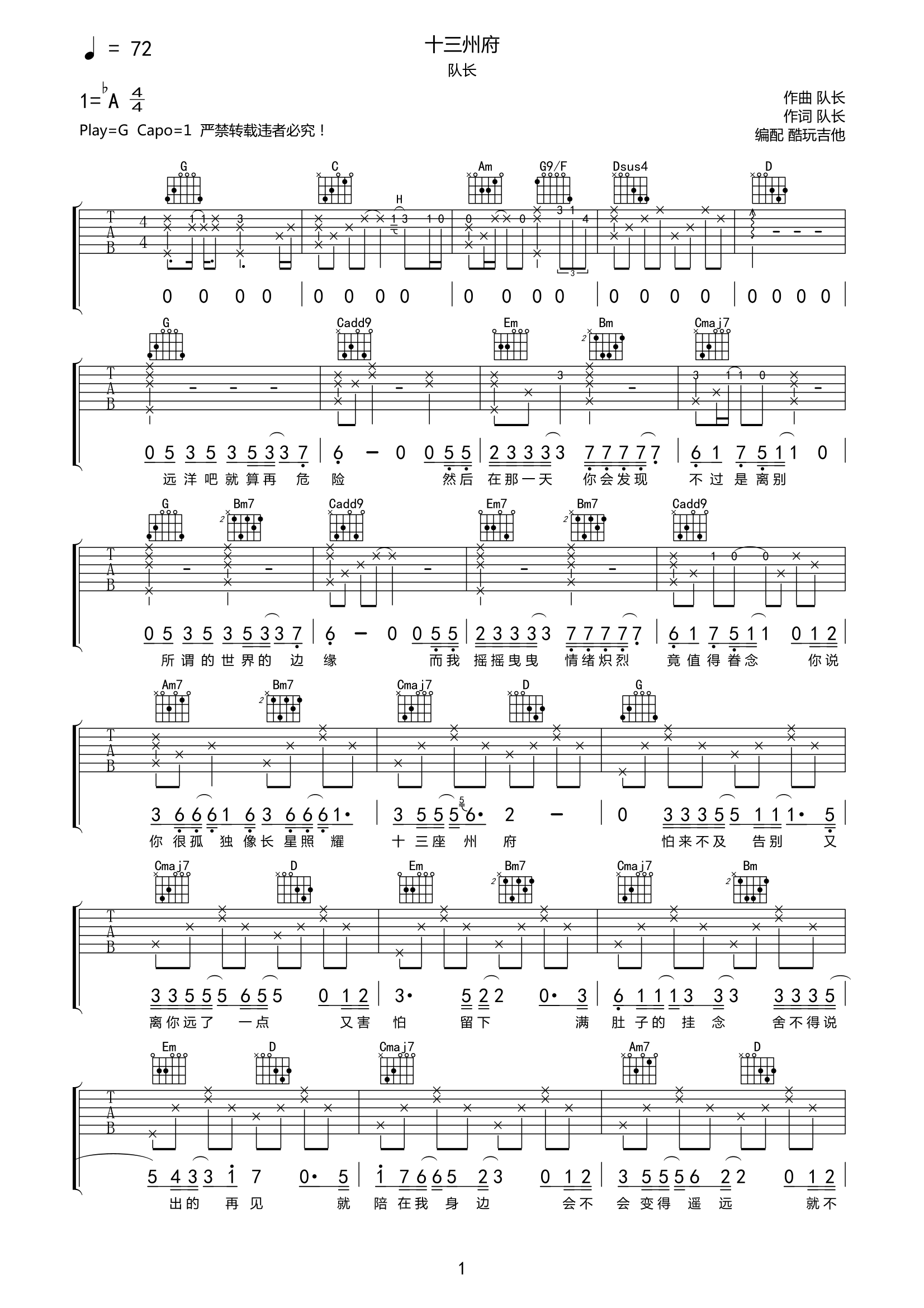 队长《十三州府》吉他谱-G调弹唱谱高清原版队长这首新歌《十三州府》写给他一位去了另一世界的朋友歌词写到:你说你很孤独,像长星照耀十三州府情感里有不舍与说不出口的思念反向映射自己的孤单蕴含在歌里的情感已经被听者清晰感受到...