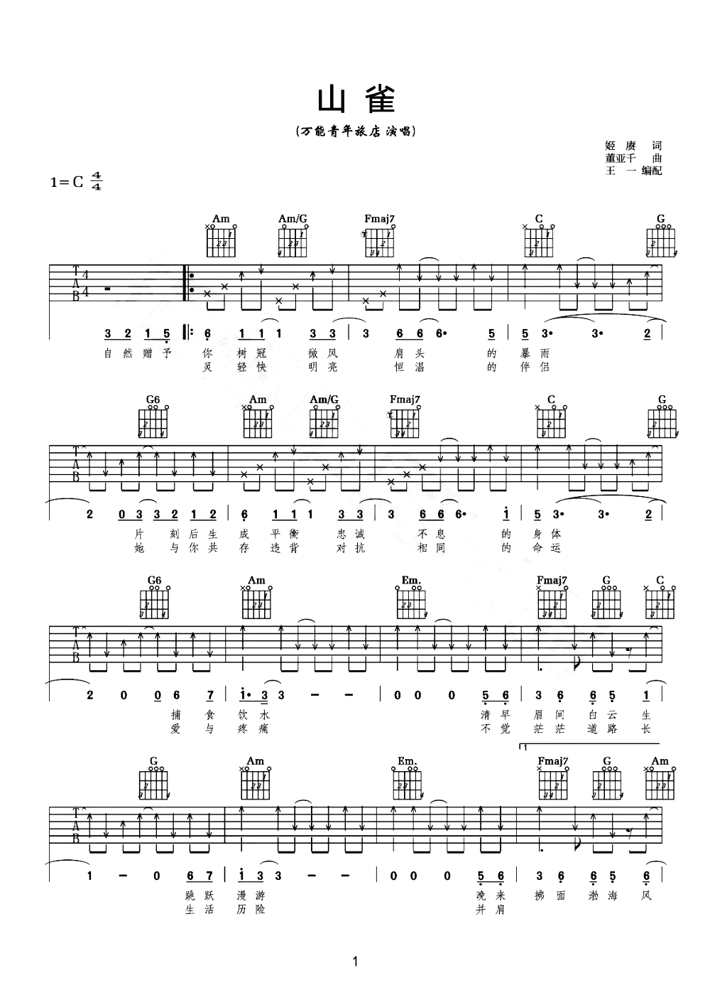 山雀吉他谱_万能青年旅店_C调曲谱选用C调和弦指法,和弦编配基本完全遵循了原曲,好听又好弹...