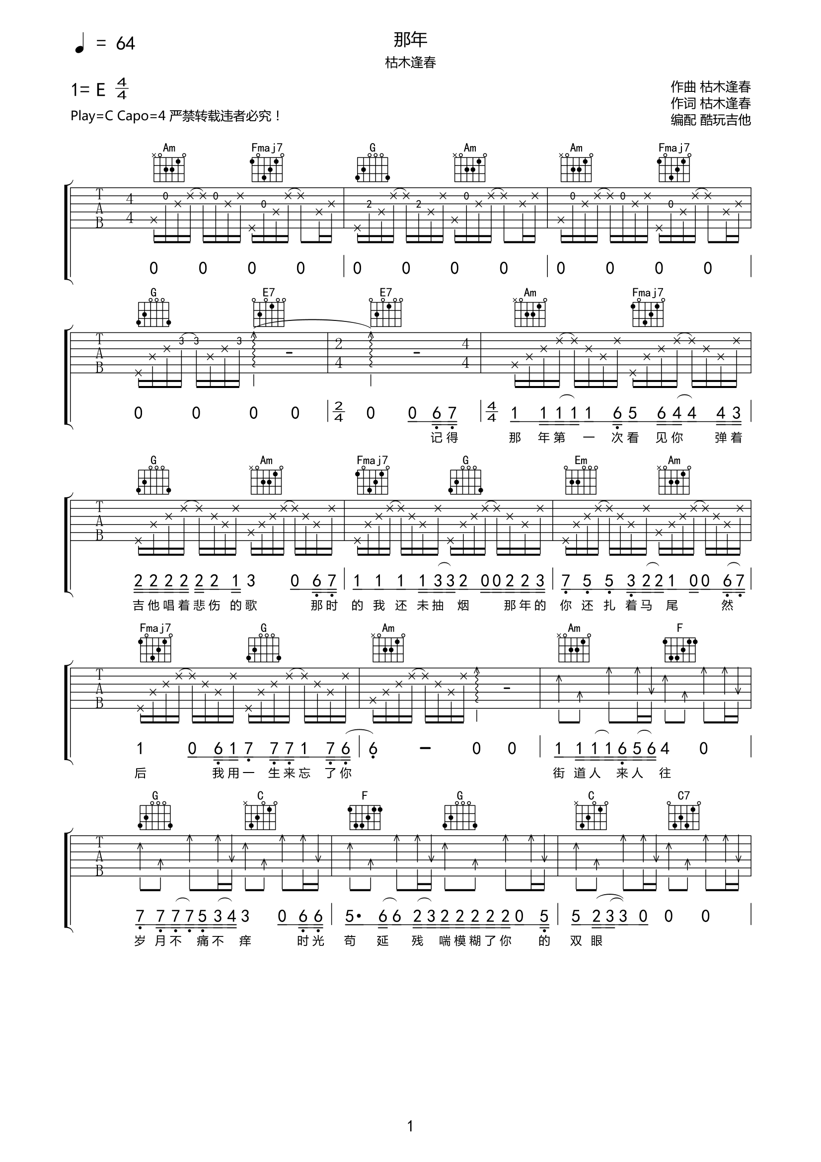 吉他枯木逢春《那年》吉他谱-C调弹唱谱原版谱