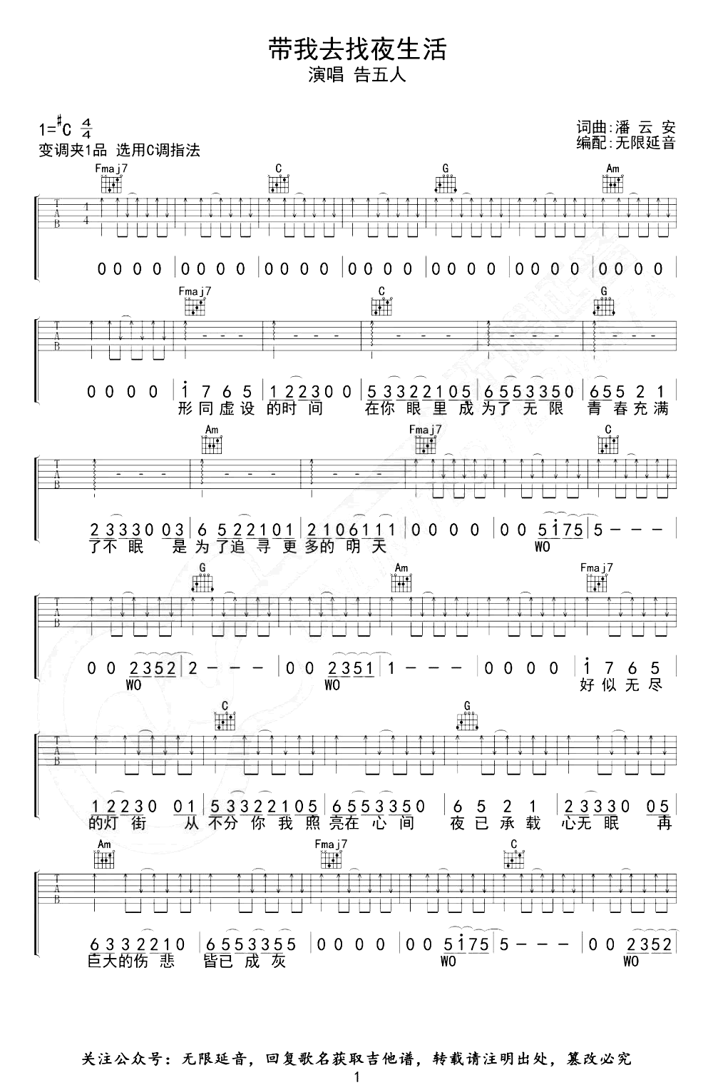 带我去找夜生活吉他谱_C调_告五人_弹唱六线谱原调升C,变调夹夹一品,选用C调指法,三张图片六线谱。...