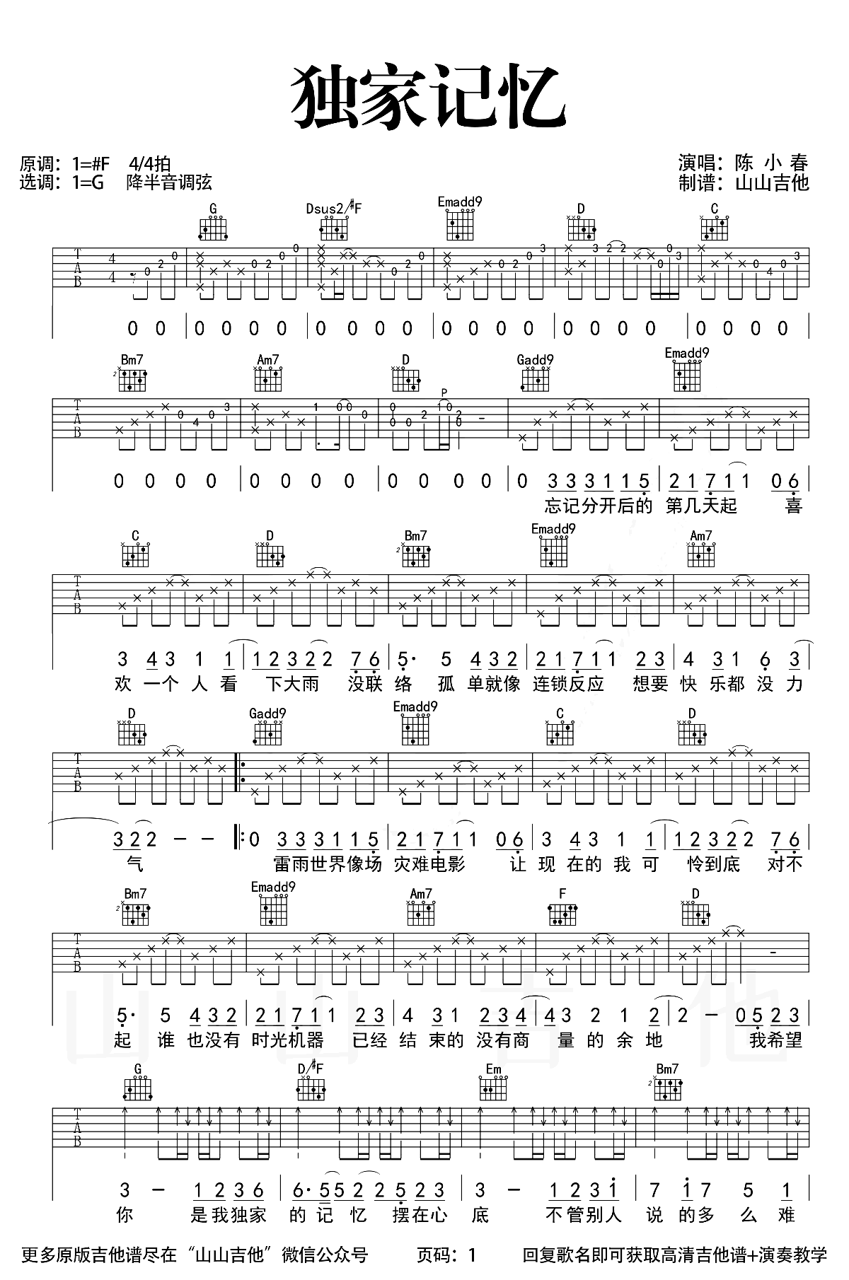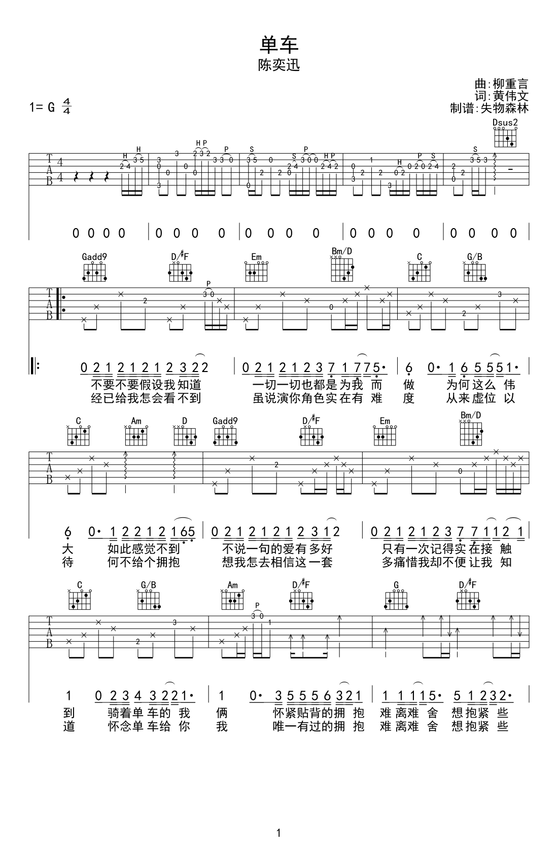 吉他单车吉他谱_G调_陈奕迅《单车》弹唱六线谱