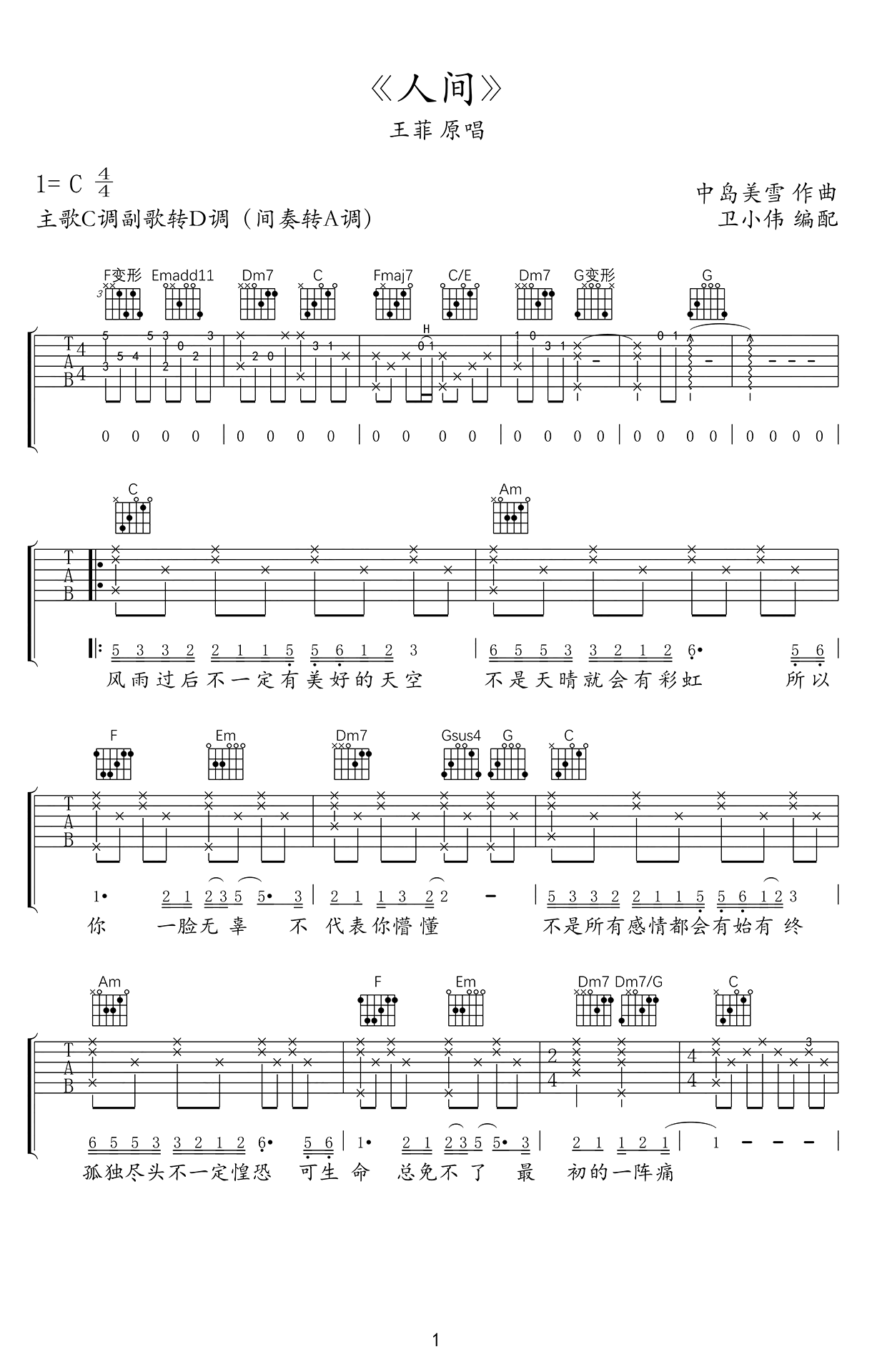 人间吉他谱_C调原版_王菲《人间》弹唱六线谱原曲C转D,间奏转A调,还原度高,包含前奏、间奏(扫弦),难度不高,有横按。...