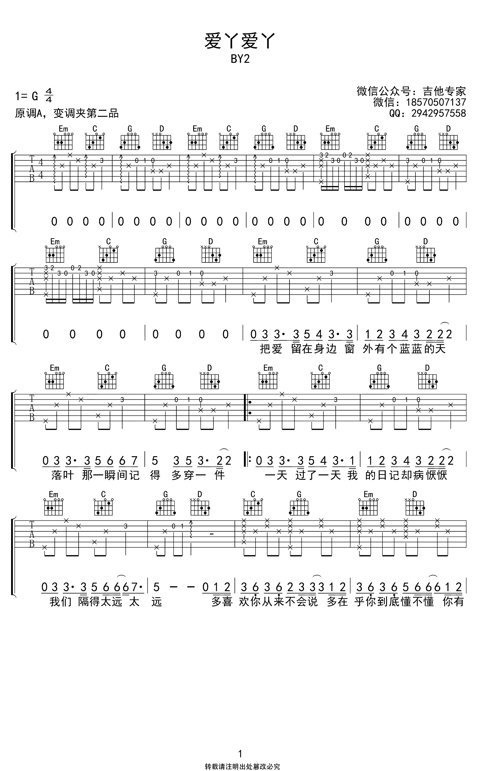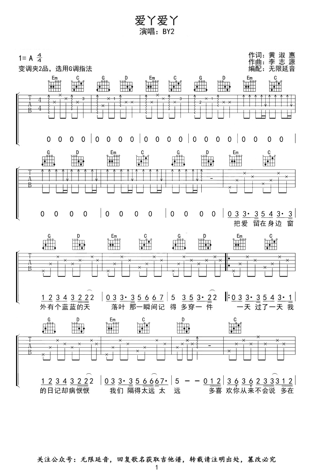 吉他爱丫爱丫吉他谱_BY2_G调弹唱谱_高清六线谱