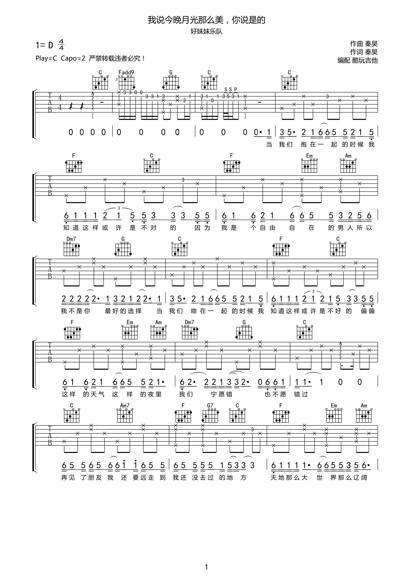 好妹妹《我说今晚月光那么美,你说是的》吉他谱-C调弹唱谱高清原版谱《我说今晚月光那么美,你说是的》收录于好妹妹乐队暖心民谣之旅之二《南北》。创作于2012年,作词和作曲均为成员之一的秦昊(浪客秦昊),先锋音乐制作人黄立炜制作。...