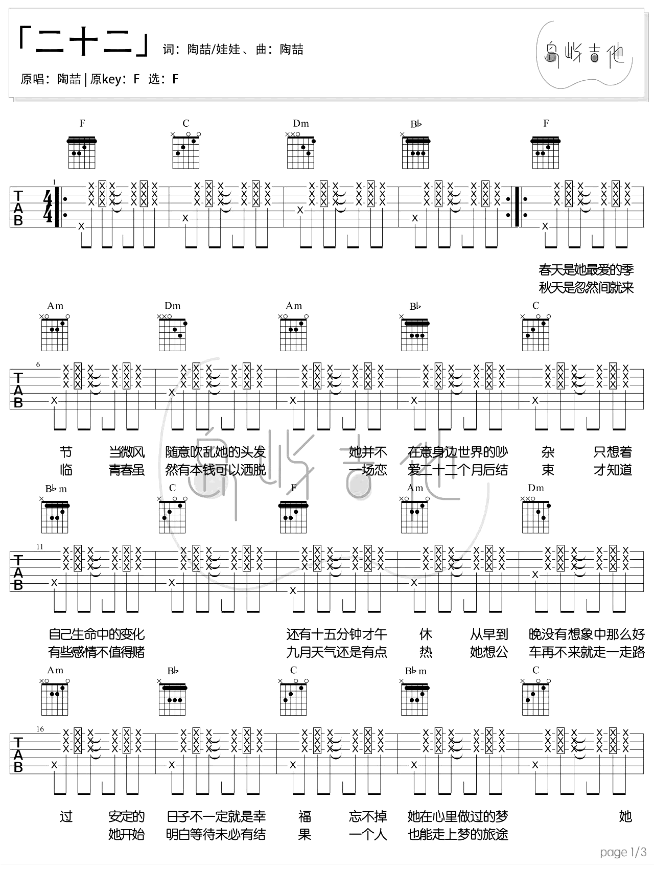 二十二吉他谱_陶喆_F调_《二十二》弹唱六线谱《二十二》吉他弹唱谱,完整编配共三张图片六线谱。...