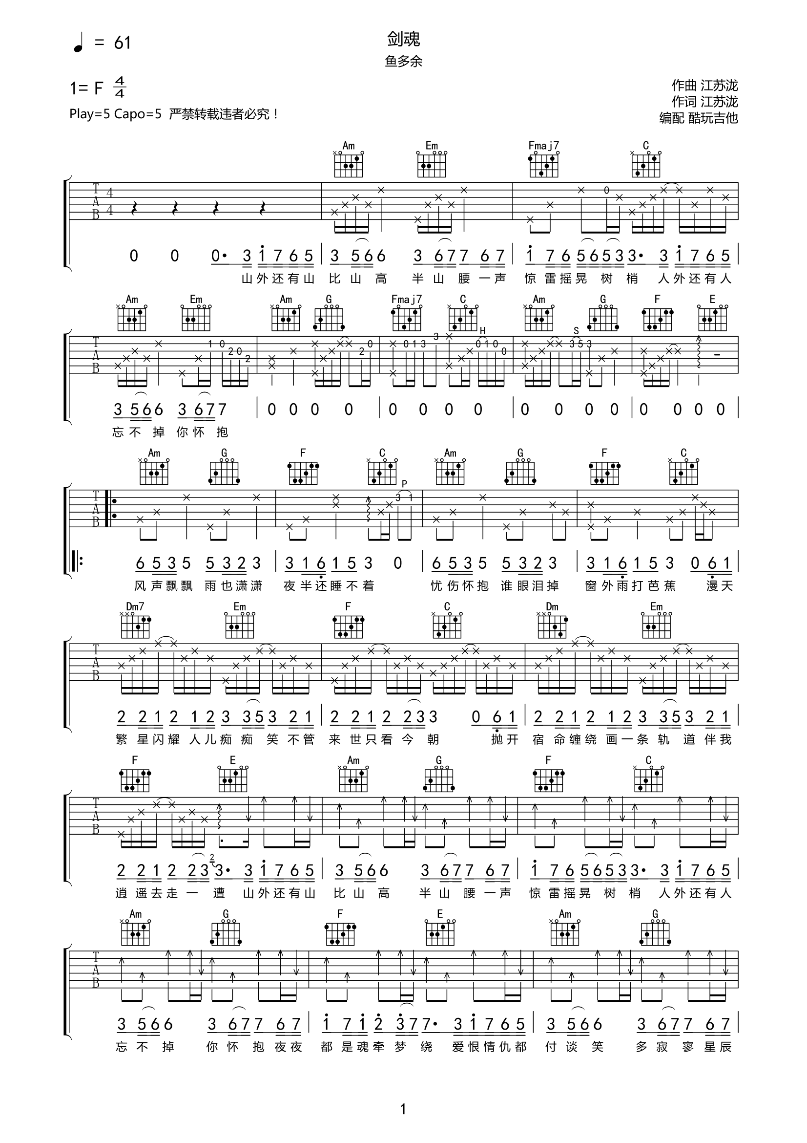 鱼多余《剑魂》吉他谱-C调弹唱谱高清原版射雕英雄传插曲《剑魂》原是汪苏泷为2017年内地版金庸剧《射雕英雄传》所量身创作的插曲,交由李炜演唱。这些年,我们听过了汪苏泷为影视剧创作并演唱的多首金曲,如《微微一笑很倾城》的片头曲《一笑倾城》、《花千骨》主题曲《年轮》等。作为“青春·武...