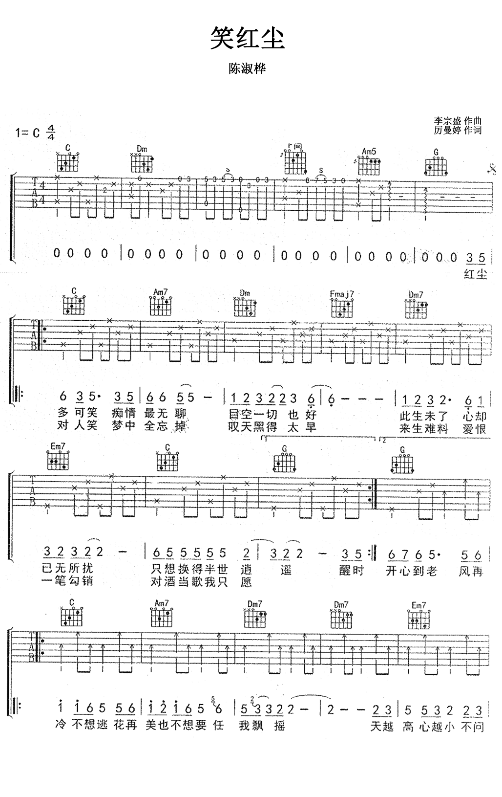 吉他笑红尘吉他谱_C调_陈淑桦_逍遥版_弹唱六线谱