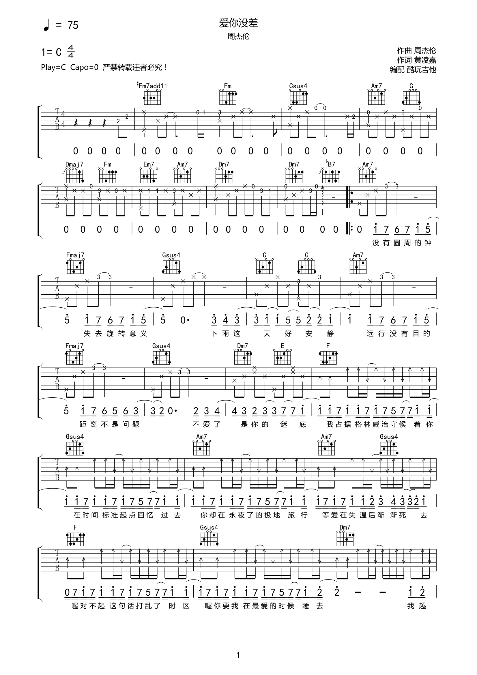 吉他周杰伦《爱你没差》吉他谱-C调弹唱谱高清原版谱