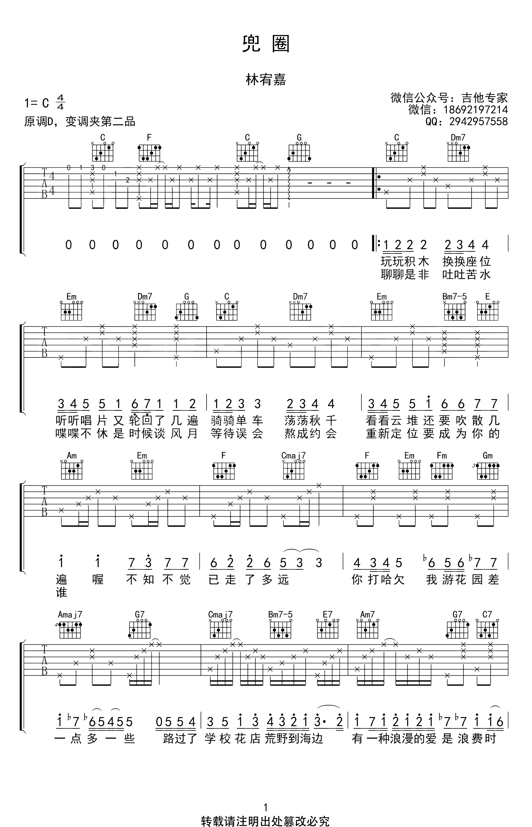兜圈吉他谱_C调_林宥嘉《兜圈》弹唱六线谱原调D,选调C,变调夹第二品,三张高清图片六线谱。原曲后面部分有转调,我们做谱子的时候有简化,没有转。...