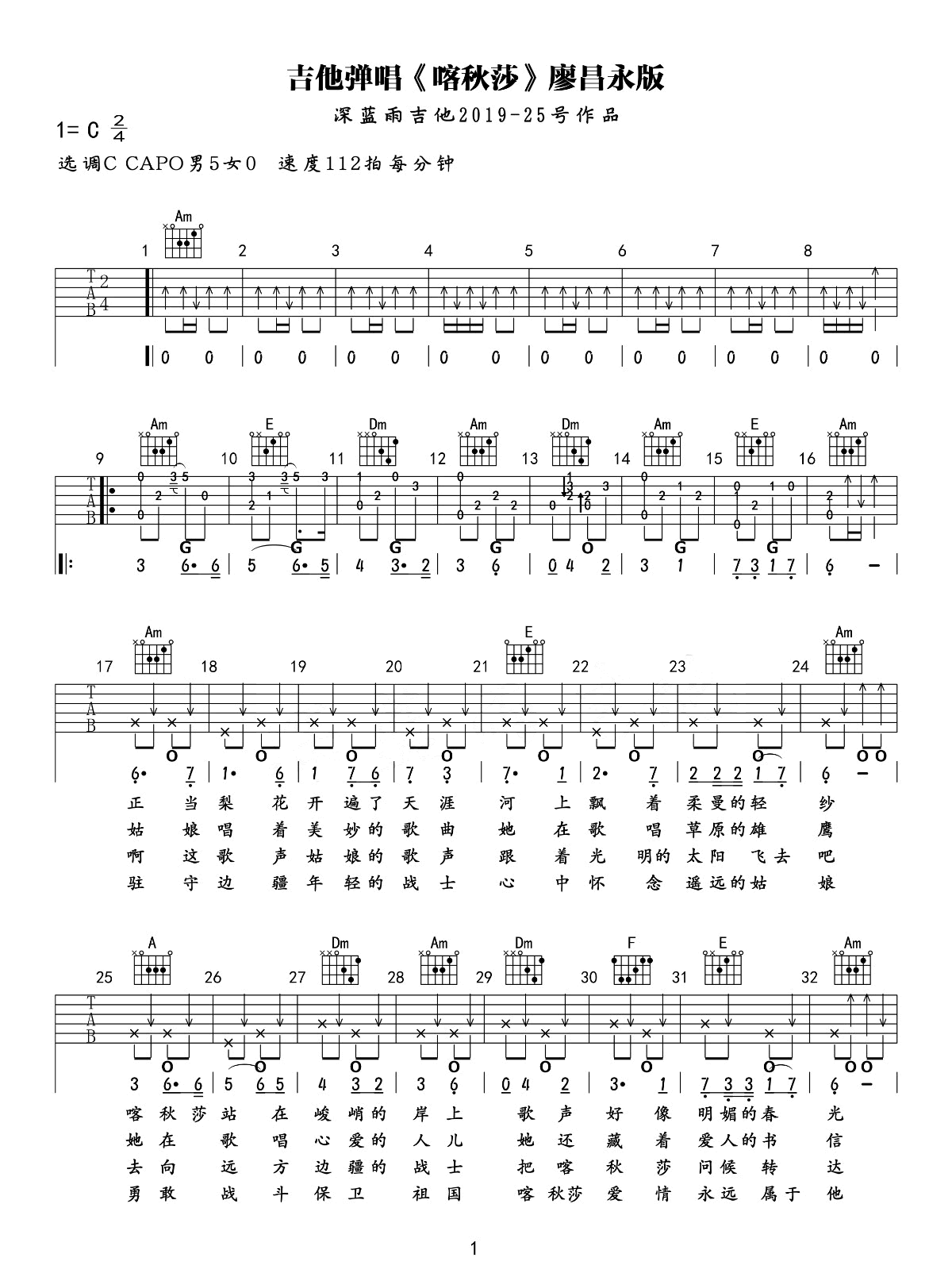 喀秋莎吉他谱_C调弹唱谱选用C调指法编配,CAPO推荐男生夹5品女生不夹,歌曲节奏明快,速度每分钟112拍。曲谱的前奏和尾奏有些难度,需琴友们花时间练习,其它部分和弦与节奏都相对比较简单。...