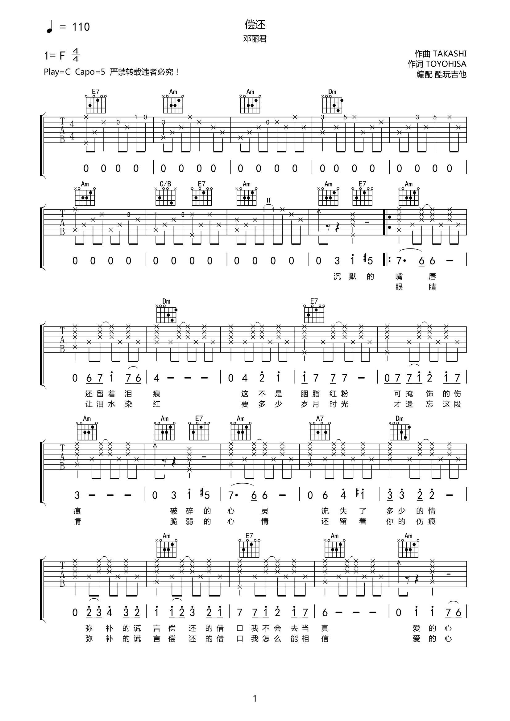 邓丽君《偿还》吉他谱-C调弹唱谱高清原版谱偿还是邓丽君主唱的一首翻译自日语歌《つぐない》的国语歌,由宝丽金在1985年香港台湾发行。《偿还》(《つぐない》,中文译名:赎罪),是著名华人歌手邓丽君1984年重返日本乐坛后发表的首张日文单曲,由荒木丰久(荒木とよひさ)作词,三木刚(三...