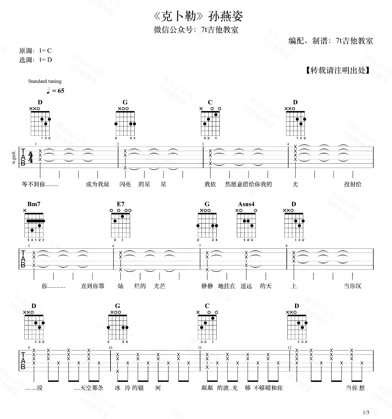 克卜勒吉他谱_C调_孙燕姿_吉他选用了D大调的指法来编配,变调夹夹在第一品。如想弹原调需降全音调弦...