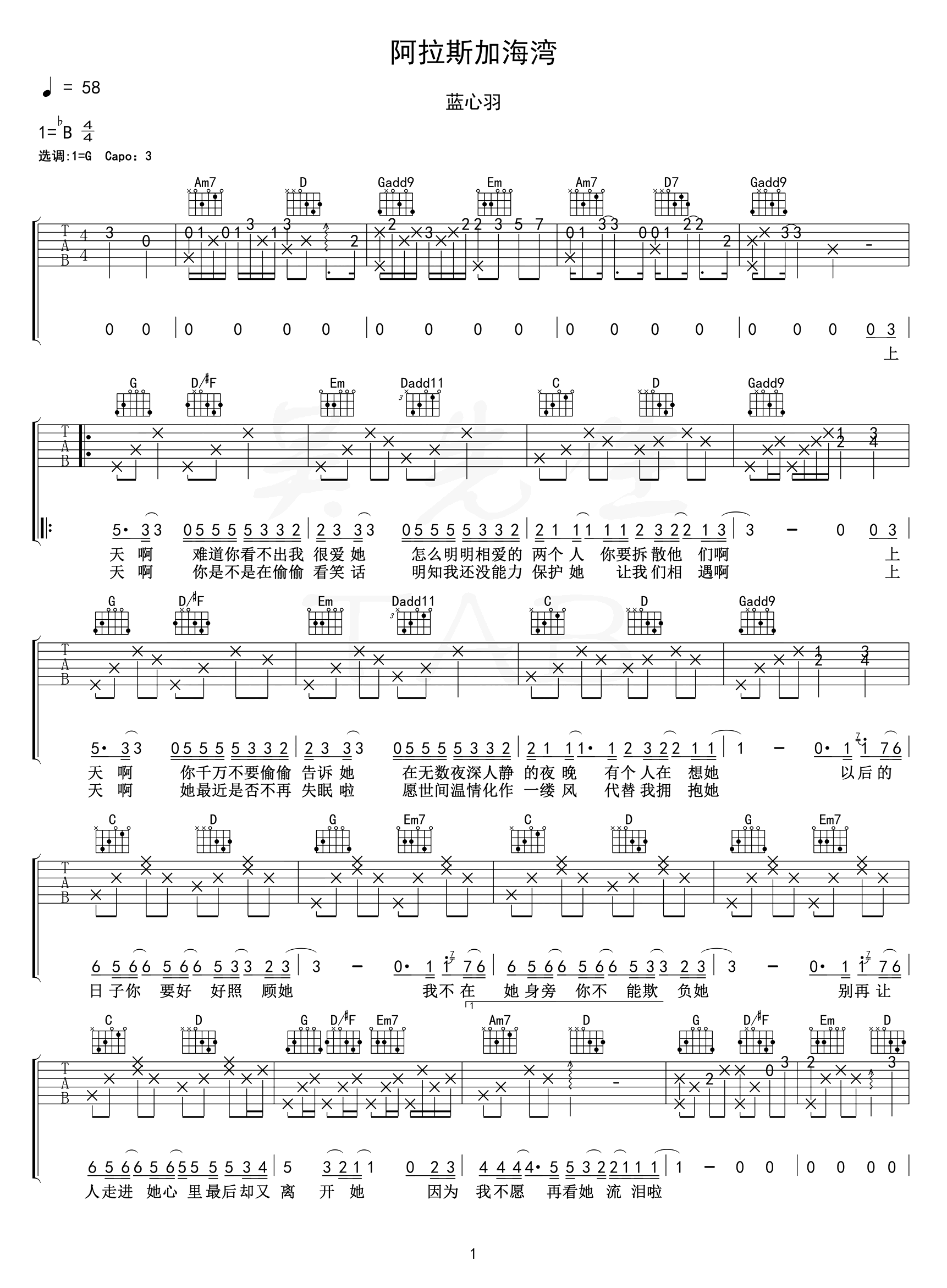 阿拉斯加海湾吉他谱_G调_蓝心羽_高清弹唱六线谱原调降B,选调G,CAPO夹三品,两张高清图片六线谱。...