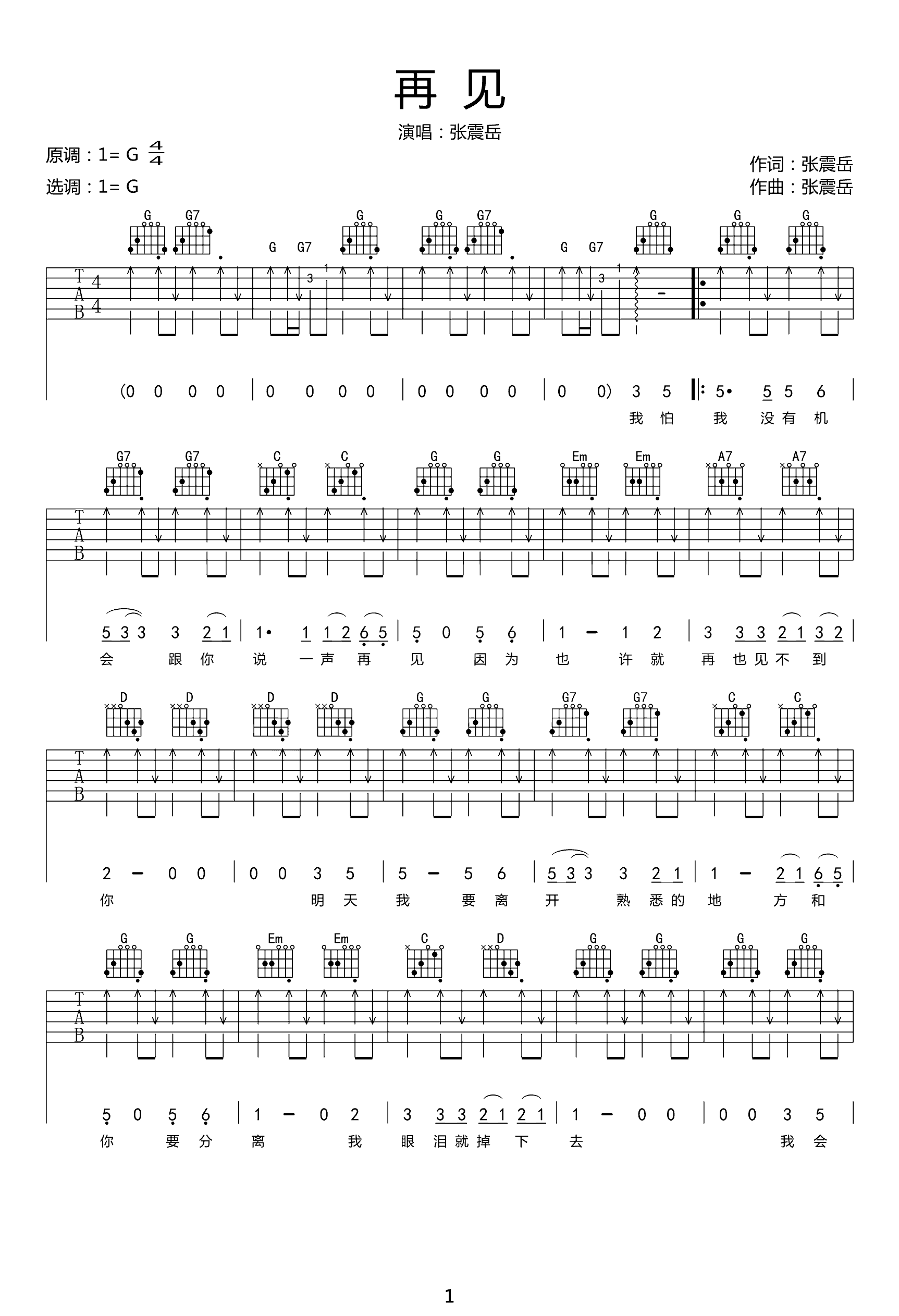 再见吉他谱_张震岳_G调原版_高清弹唱六线谱...