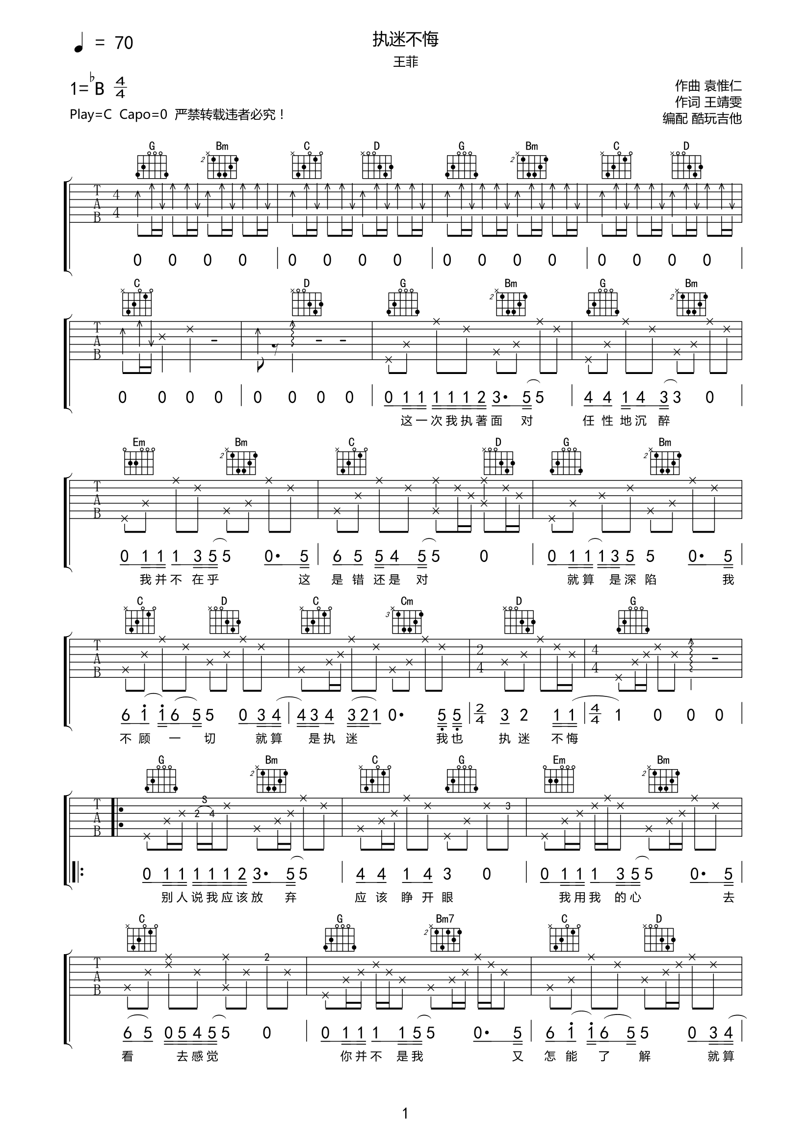 吉他王菲《执迷不悔》吉他谱-G调弹唱谱高清原版谱