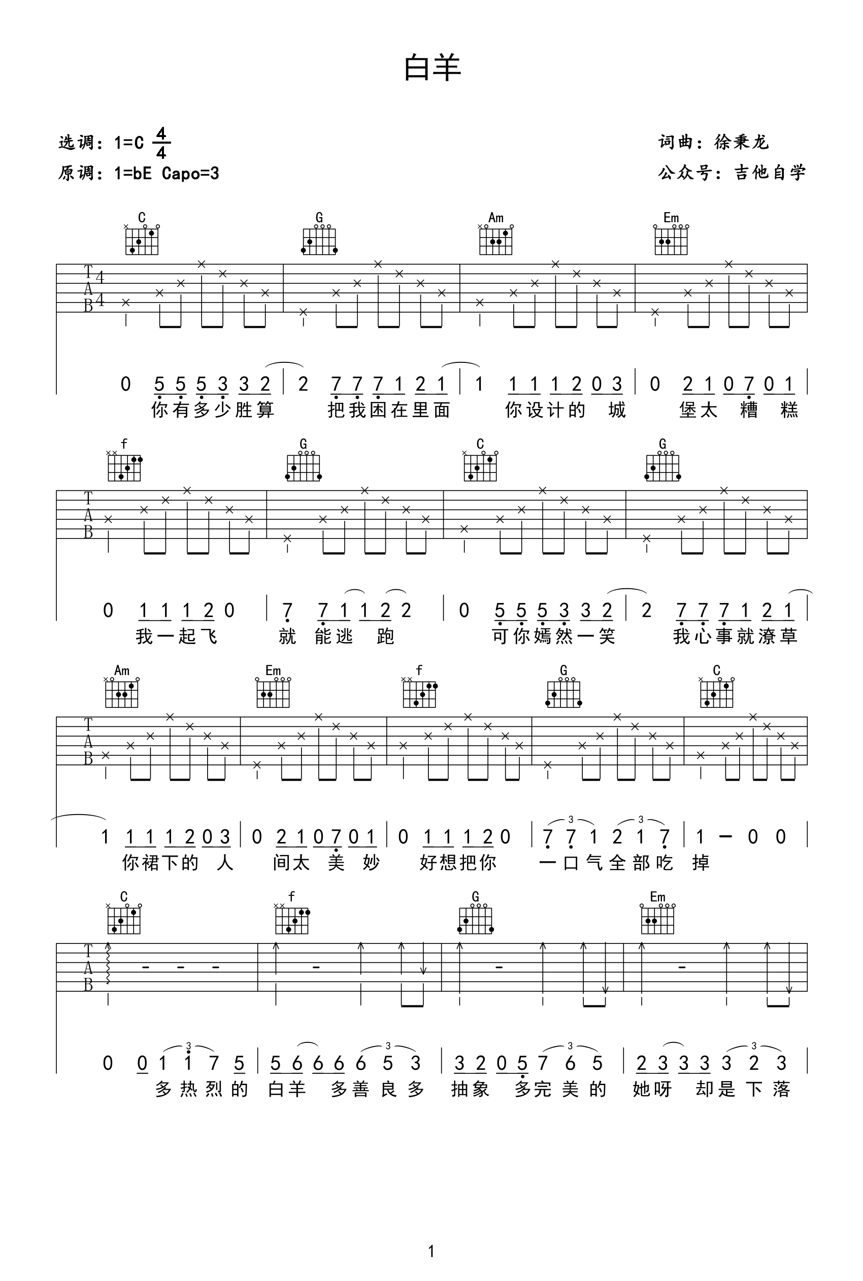 白羊吉他谱_C调_徐秉龙_弹唱谱_高清六线谱原调bE,选调C,Capo夹三品,三张高清图片六线谱。...