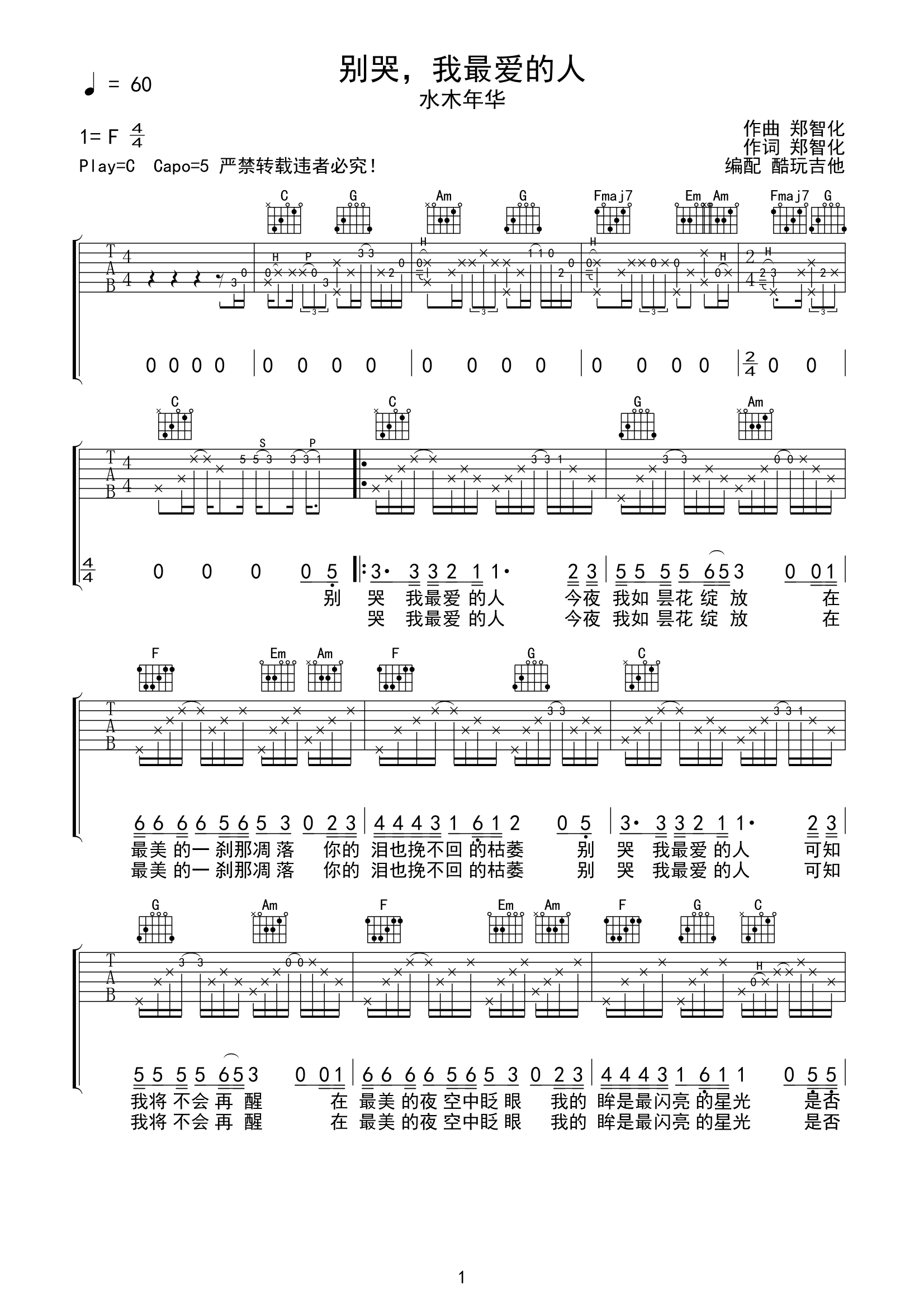 水木年华《别哭我最爱的人》吉他谱-C调弹唱谱高清原版谱郑智化《单身逃亡》专辑中的主打歌,由郑智化作词作曲,发行于1990年3月1日。...