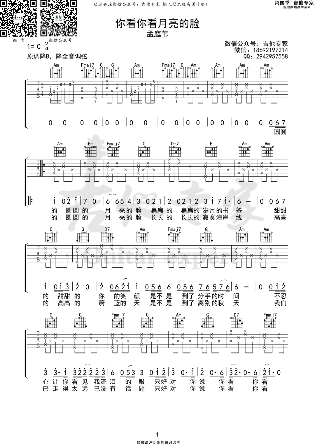 《你看你看月亮的脸》吉他谱_孟庭苇_C调吉他谱_弹唱六线谱...