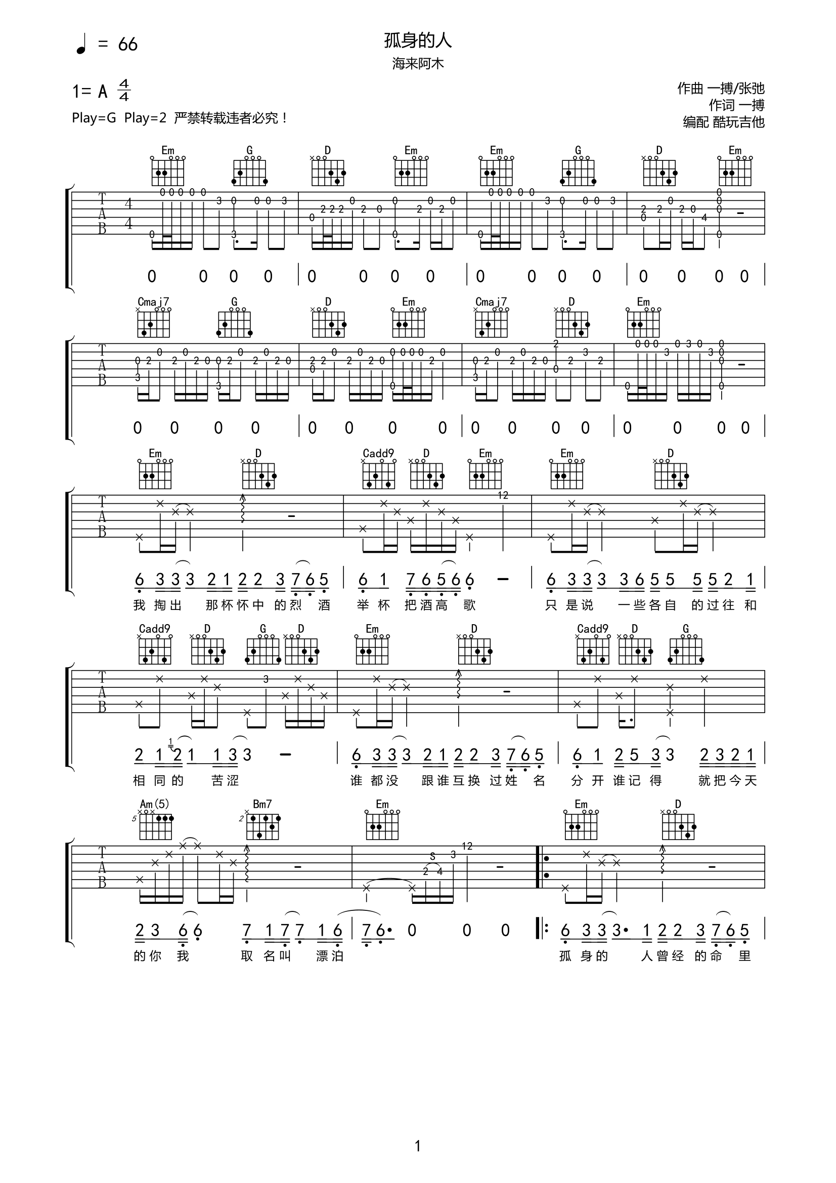 海来阿木《孤身的人》吉他谱-G调弹唱谱高清原版谱流行音乐词曲创作人一博、张池,携手实力唱将海来阿木,合作首张单曲《孤身的人》。该首歌以叙述性手法与风格,站在一个孤身漂泊者的视角里,诠释对人生和岁月的感悟。...