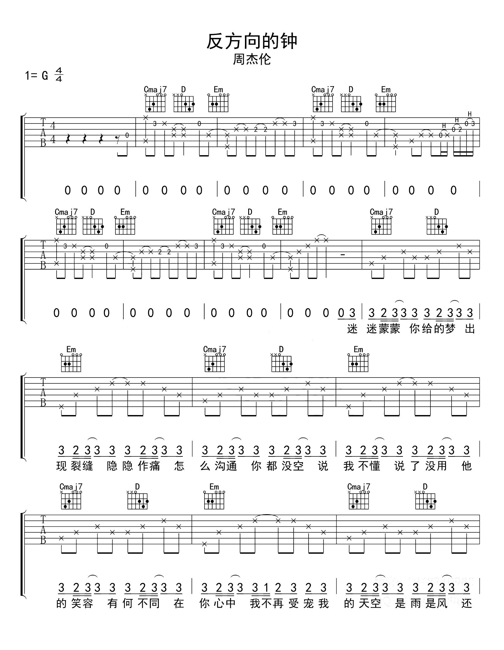 吉他反方向的钟吉他谱_G调_周杰伦_弹唱六线谱
