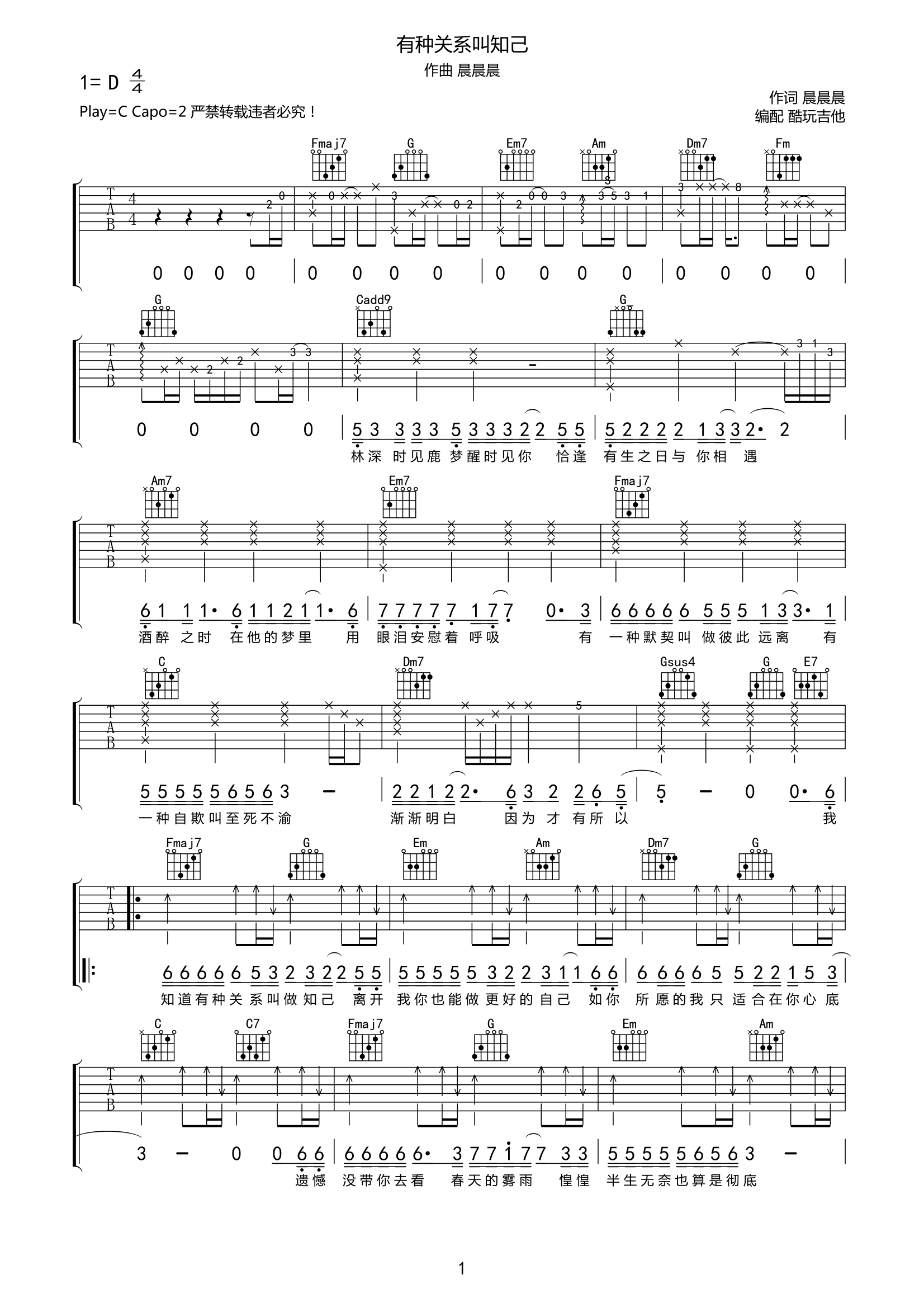 刘大壮《有种关系叫知己》吉他谱-C调弹唱谱高清原版谱城市的高楼大厦,五彩的霓虹灯牌,我们,在这一站离开,是否如释重负却舍不得说一句拜拜?在下一次再见,是否还是初遇后羞涩的笑颜?每个人的青春都有相爱的人,这一段相爱却难以藕断丝连。在宁静的深夜想挽回,在清朗的黎明又卑微。...