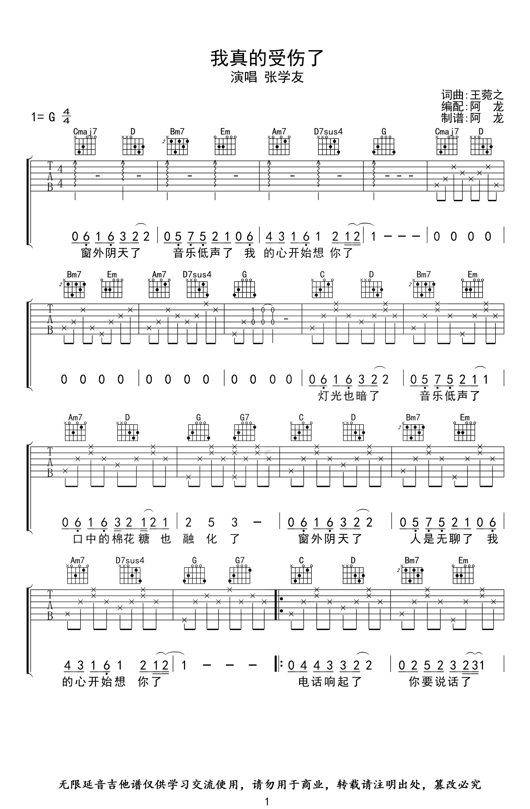 我真的受伤了吉他谱_G调_张学友_弹唱六线谱G调和弦指法编配,两张图片高清六线谱...