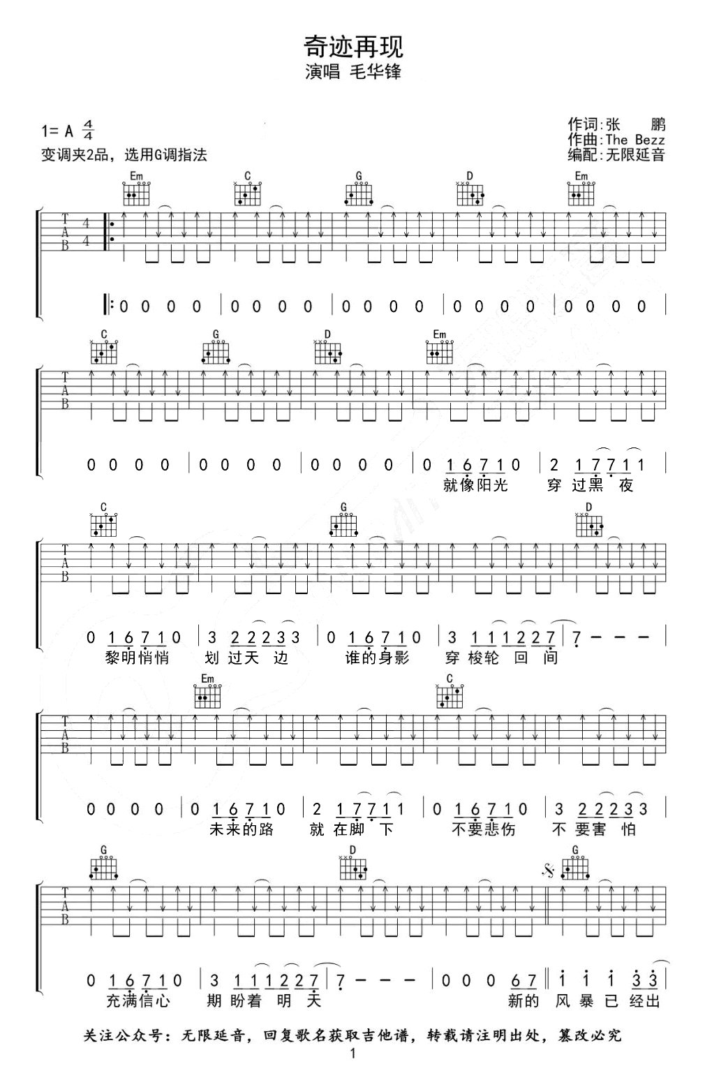 奇迹再现吉他谱_G调_毛华锋《迪迦奥特曼》主题曲原调A选调G,变调夹夹第二品,两张图片六线谱。...