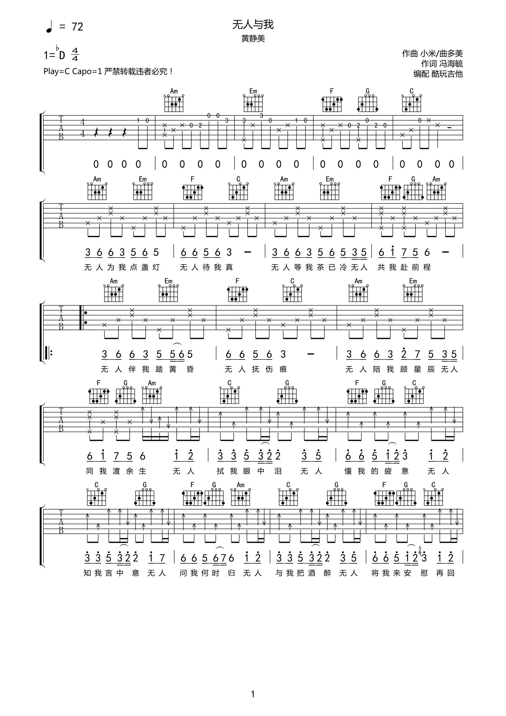 吉他黄静美《无人与我》吉他谱-C调弹唱谱高清原版谱