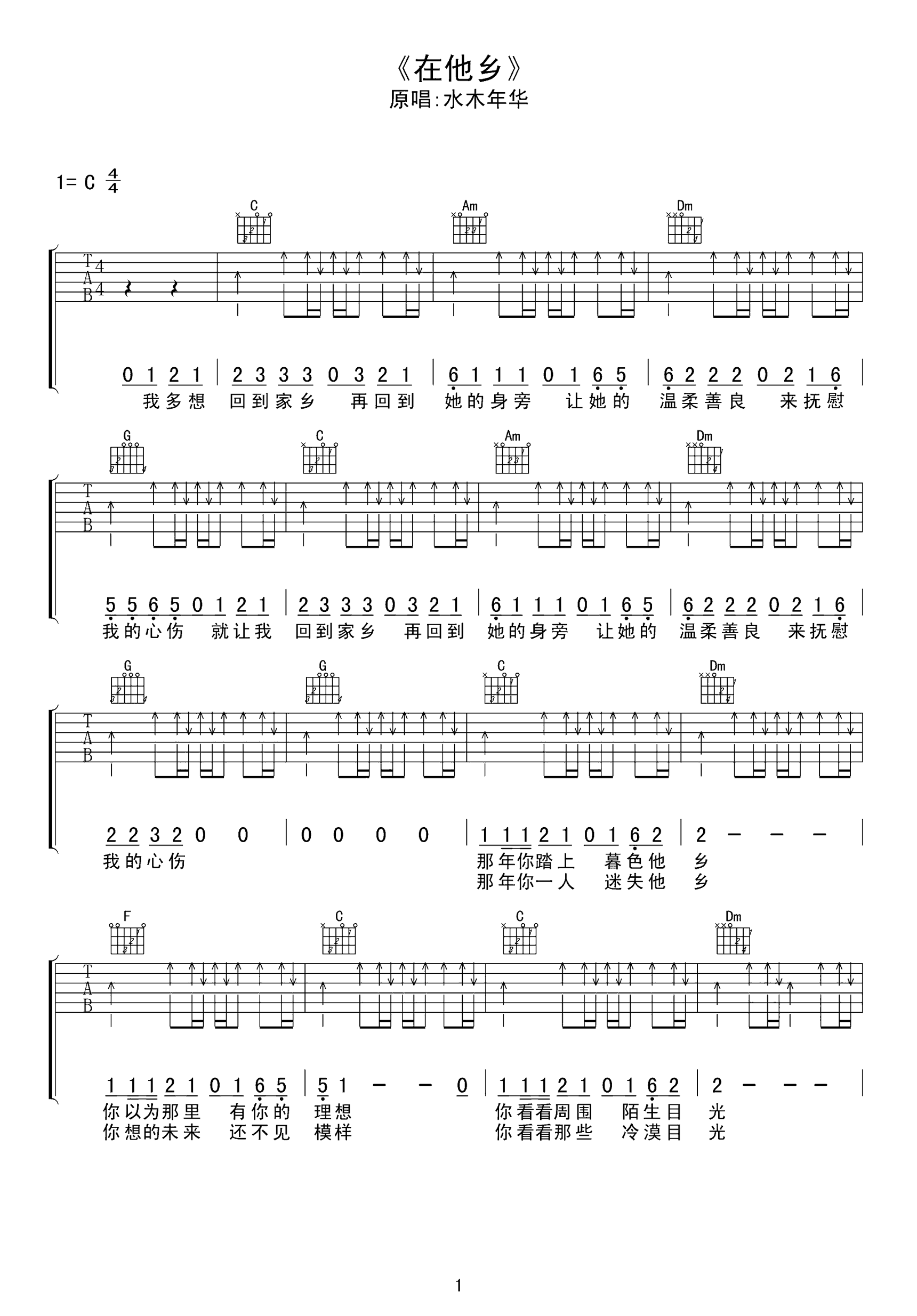 在他乡吉他谱_C调扫弦版_水木年华_弹唱六线谱在他乡》吉他弹唱谱,三张高清图片六线谱。歌曲他难度不大,演奏时要注意扫弦节奏的准确性,注意节奏强弱律动,多加练习即可。...