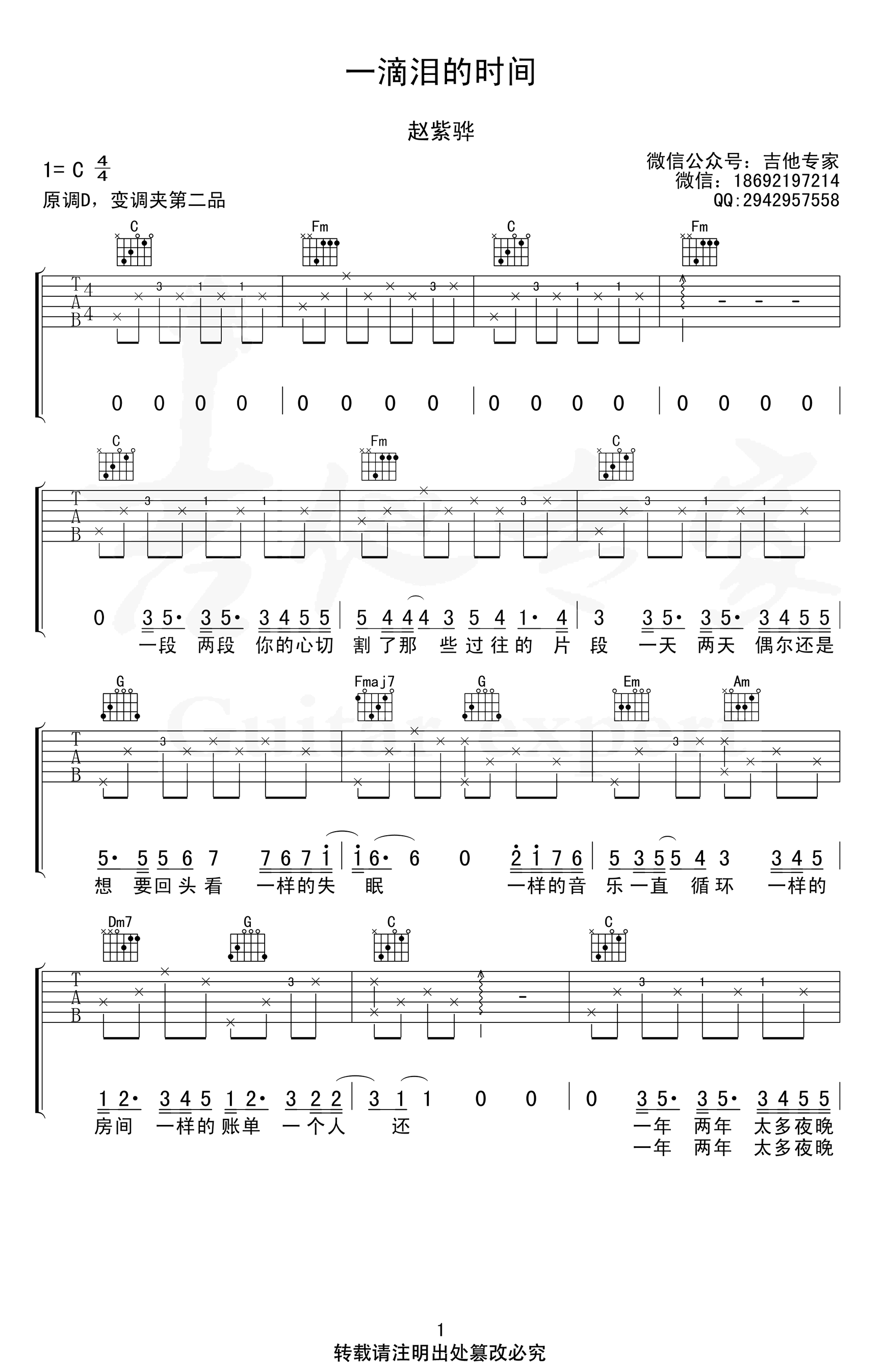一滴泪的时间吉他谱_C调_赵紫骅_高清弹唱谱《一滴泪的时间》吉他弹唱谱,原调D,变调夹第二品,选用C调指法编配,六线谱共三张高清图片。...