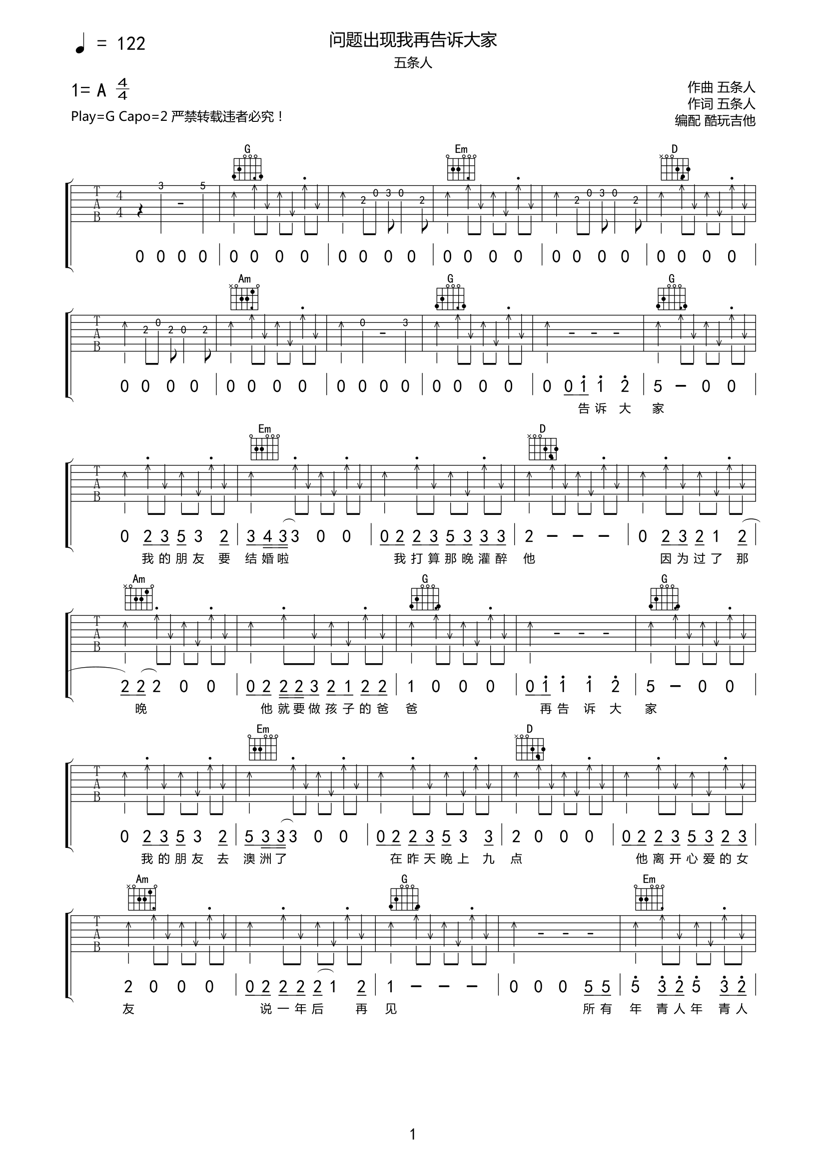 吉他五条人《问题出现我再告诉大家》吉他谱-G调弹唱谱高清原版