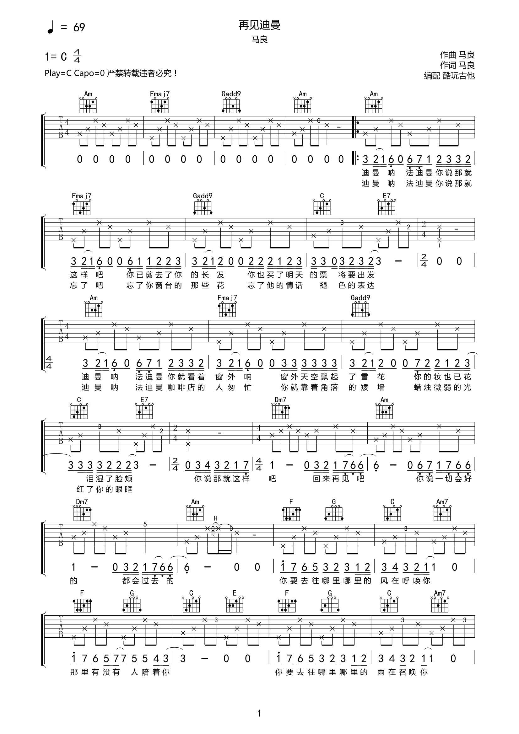 马良《再见迪曼》吉他谱-C调故事的开头总是这样,适逢其会,猝不及防。...